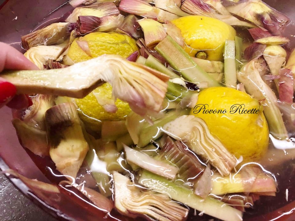 Riempiamo una ciotola con acqua fredda e succo di limone in modo che i carciofi non anneriscano.