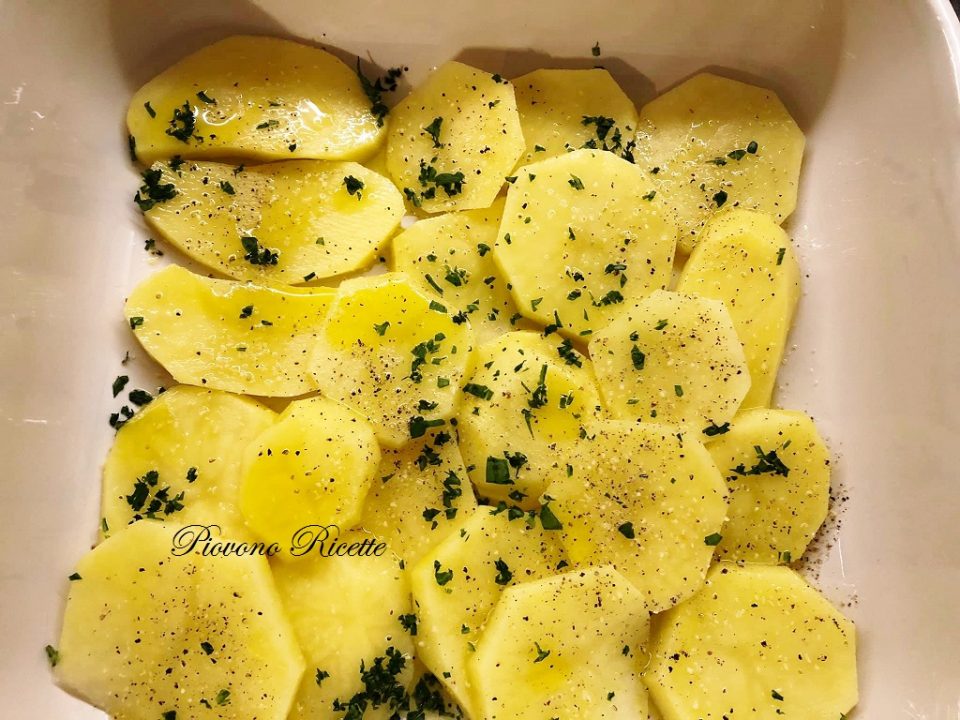 Disponiamo sul fondo il primo strato di patate, sovrapponendole leggermente in modo da non lasciare spazio tra loro.