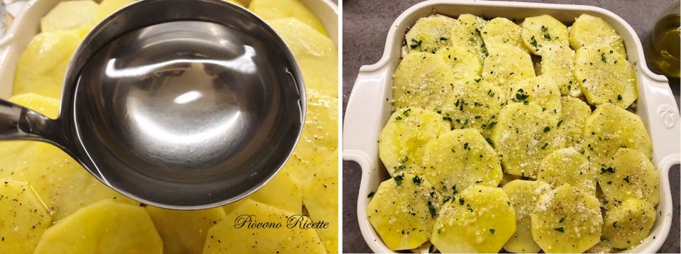 Aggiungiamo quindi l’acqua un pò alla volta e fino a raggiungere il livello dell’ultimo strato di patate, che andremo poi a gratinare (come in foto).