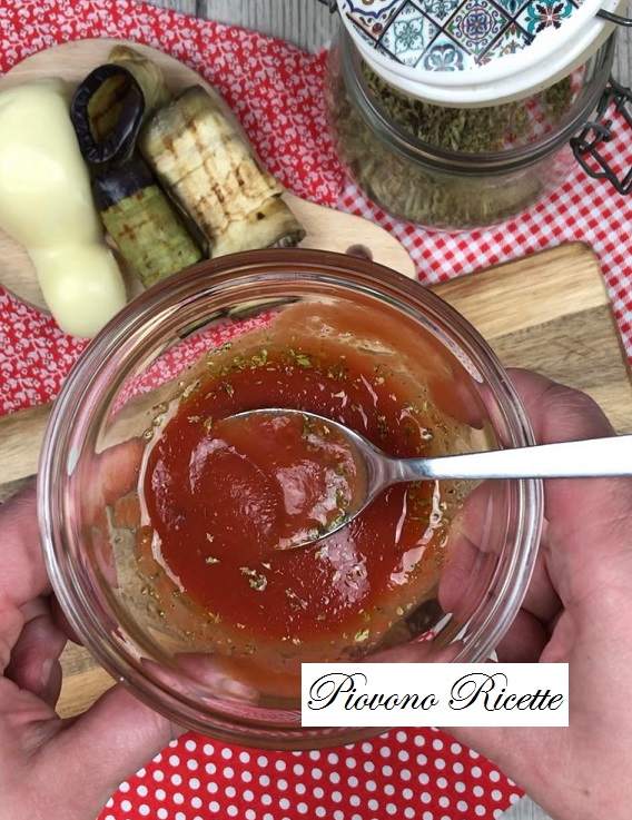 In una ciotola uniamo: sei cucchiai di passata di pomodoro, un pizzico di sale, un goccio d‘olio ed un pò di origano.