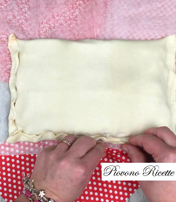 Quindi ripieghiamo il rettangolo di pasta sfoglia su se stesso, in modo da chiuderlo (come in foto).
