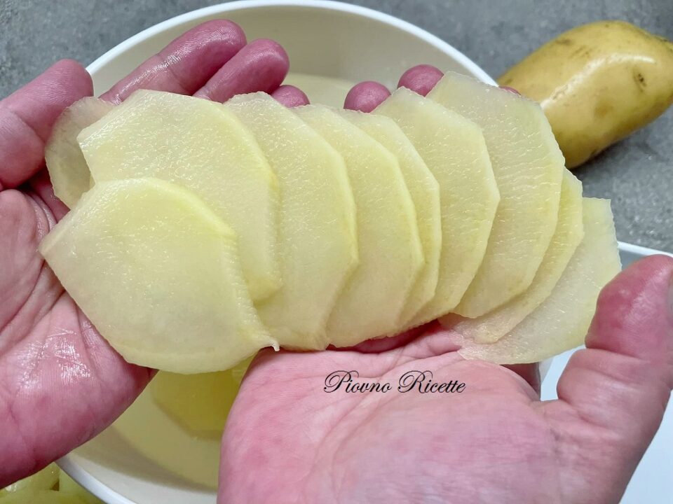 Peliamole e tagliamole a fettine molto sottili con l’aiuto di una mandolina