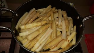 Pulire gli asparagi dividendoli in due e, con l’aiuto di un pelino o pelapatate, privarli della corteccia esterna dura.