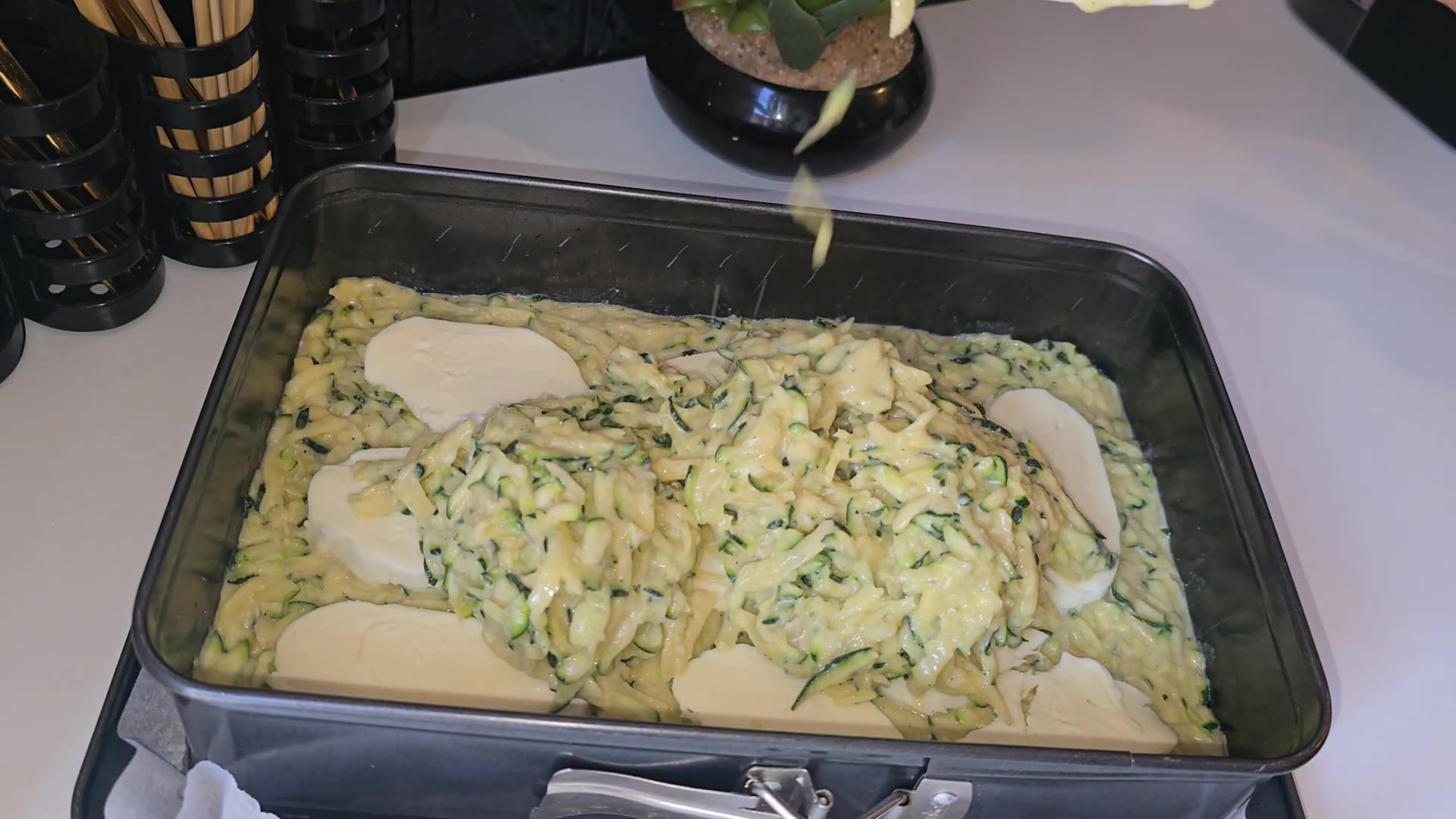 Componi la teglia: Rivesti una teglia con carta forno e ungila con un filo d’olio. Versa metà del composto livellandolo bene. Aggiungi uno strato di fette di scamorza e copri con il resto dell’impasto.