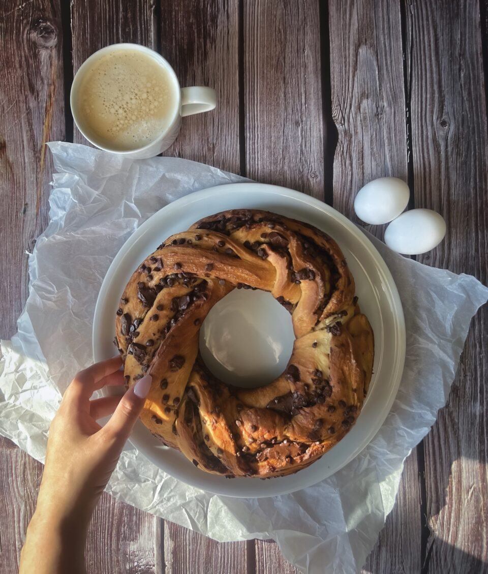 Questa squisita delizia è rinomata per il suo aspetto incantevole e il suo gusto delizioso, rendendolo uno dei preferiti durante le occasioni e le riunioni festive. L’impasto, arricchito con burro e uova, viene srotolato e riempito con una deliziosa miscela di uvetta, buccia d’arancia candita e gocce di cioccolato, creando una deliziosa interazione di consistenze e sapori. Il pane viene quindi attorcigliato in un anello intrecciato, che non solo gli conferisce un sorprendente fascino visivo, ma garantisce anche una distribuzione uniforme del ripieno.