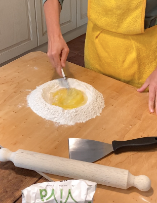 Mettere sulla spianatoia le farine e fare con le mani un buco al centro. Tipo un vulcano!