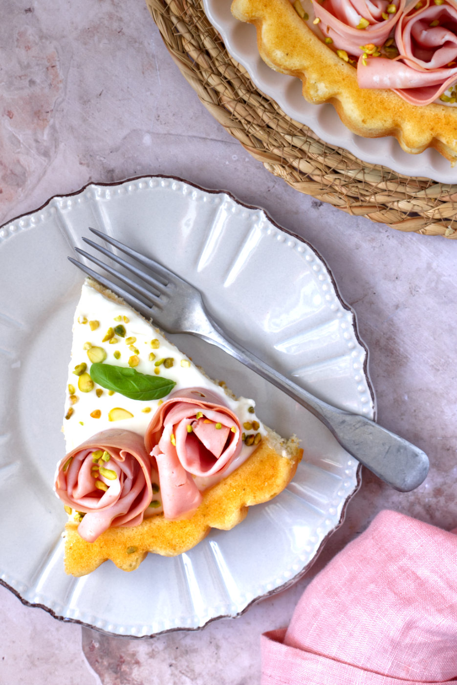 Per il ripieno ho semplicemente spalmato dello stracchino e ho decorato con delle fette di mortadella e pistacchi.