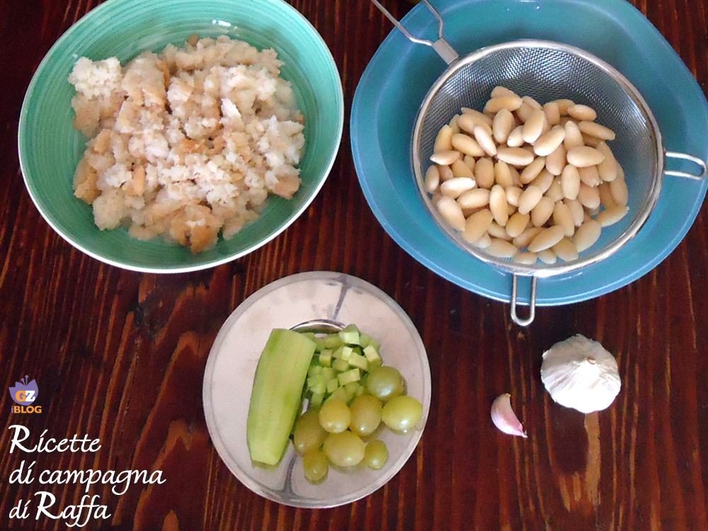 – Ammollate il pane, strizzatelo ed inseritelo nel frullatore insieme alle mandorle scolate, l’aglio, l’aceto e il sale.