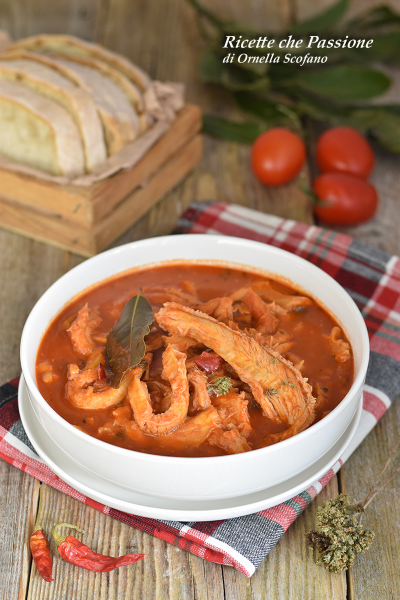 Il morsello di trippa di vitello alla catanzarese è senza dubbio uno dei piatti più noti della cucina calabrese, quello che più di tutti rappresenta la città di Catanzaro, anche se la cucina catanzarese si può vantare di molti piatti tipici, come la tiana di agnello tipica delle feste. Il morsello viene servito nella classica pitta catanzarese, un pane a ciambella dal buco largo, che lo rende un pane stretto, perfetto per essere farcito con il succoso intingolo, che si può addentare in un solo morso, da qui probabilmente il nome morsello, o anche dal fatto che la carne è tagliata in piccoli pezzi, nel dialetto catanzarese morzha morzha da cui morzello o morzeddhu o ancora morsello. Il morsello è uno dei cibi da strada più antichi di Catanzaro, lo consumavano gli operai, che a lavoro dalle prime ore dell’alba già alle 9-10 di mattina avevano bisogno di consumare una colazione sostanziosa. Si tratta di un piatto di origini antiche, secondo alcuni fu portato dall’oriente, durante le invasioni dei territori calabresi, secondo i catanzaresi il piatto nasce qui perchè la pitta, anche se simile al pane pita arabo è unica per forma, infatti nella stessa Calabria si produce una pitta diversa, con un buco più stretto e quindi più larga, con più mollica. Certo è che nasce come piatto povero, per sfamare anche le classi più bisognose. Un tempo a Catanzaro c’erano tanti chioschetti dove si poteva acquistare la pitta con la trippa, il morsello, oggi dei tanti chioschi ne rimane qualcuno, dove ancora si può gustare un buon morsello, preparato con passata di pomodoro, odori e immancabile peperoncino. Vediamo come prepararla, io di sola trippa, che è quella che mi piace, ma negli ingredienti vi dò anche quelli per il tradizionale morsello, ma fate conto che ci sono le varianti, di sola trippa, anche con fegato, cuore e milza, che è il morsello originale, poi c’è anche di sola carne di maiale, anche se il vero nome di questo piatto è il soffritto di maiale, e poi per il venerdì santo che non si mangia carne c’è il morsello di pesce.