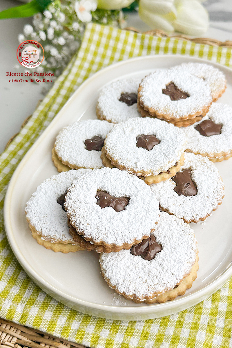 Farciamo i biscotti non intagliati con la nutella morbida usando un semplice cucchiaino. Cospargiamo con zucchero a velo i biscotti col buco al centro, usando un colino, e chiudiamo con questi i nostri biscotti. Possiamo subito gustare i biscotti appena saranno pronti. Si conservano a lungo in un contenitore chiuso, buoni e friabili scioglievoli in bocca come appena fatti.