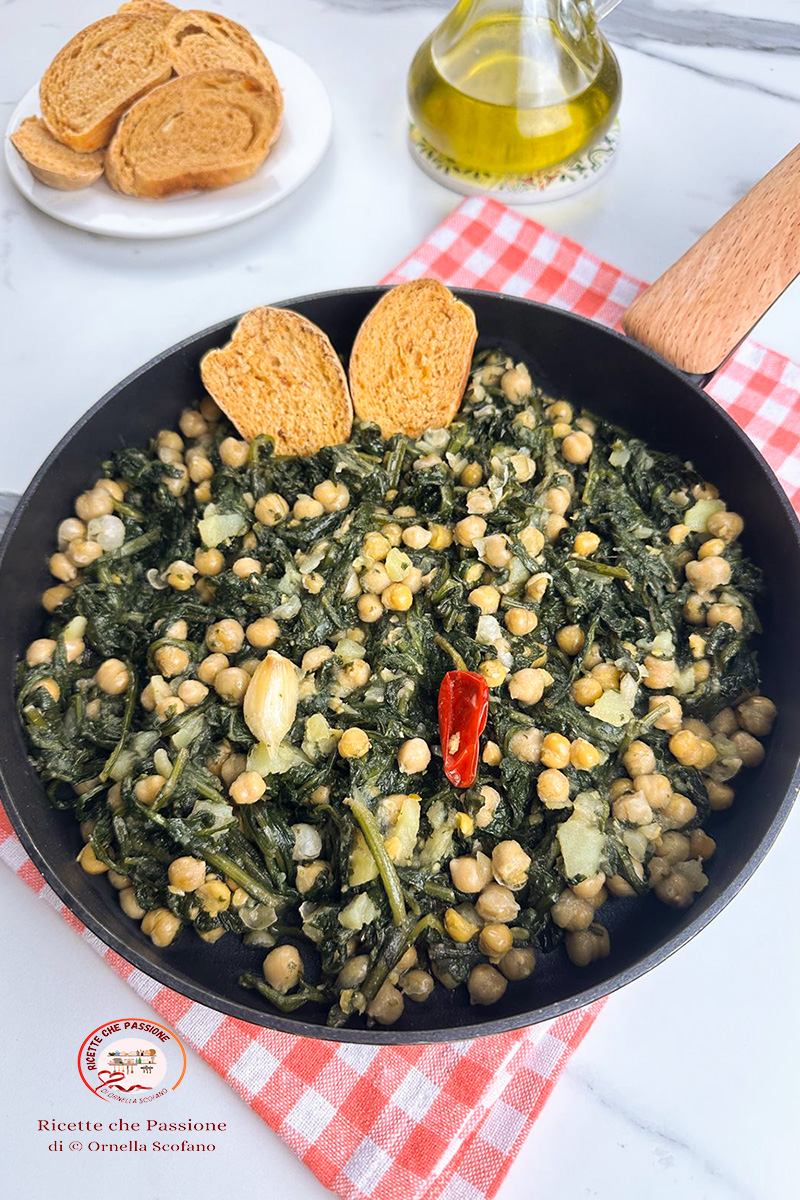 Voglia di un piatto unico sano leggero e gustoso, allora prepara con me i ceci con cicoria in padella. Un piatto dal gusto intenso e a dir poco buonissimo. Questa volta al posto della cicoria del banco ho voluto provare quella in busta, sempre fresca, l’ho cotta direttamente affogata in padella, e devo ammettere anche se tenerissima era molto più amara della cicoria tenera che acquisto solitamente al banco, quindi se non amate troppo l’amaro vi consiglio di sbollentarla prima, con una patata, o di acquistare della cicoria fresca, tenera di banco, l’ho già fatta tante altre volte a crudo e viene ottima. Io lo sapete, più è amara e più mi piace, quindi me la sono proprio gustata, poi i ceci essendo più dolci spezzano e in più avevo aggiunto anche una patata in cottura, perchè mi ero resa conto che era amarissima, alla fine per me era deliziosa, ma capisco che magari a qualcuno troppo amaro possa non piacere.