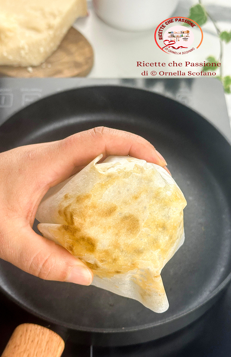 Procediamo così, con altri fogli di carta forno, altro parmigiano, fino ad esaurirlo. Ogni volta accendiamo e spegniamo il fornello, mentre lavoriamo, così evitiamo di bruciare la padella.