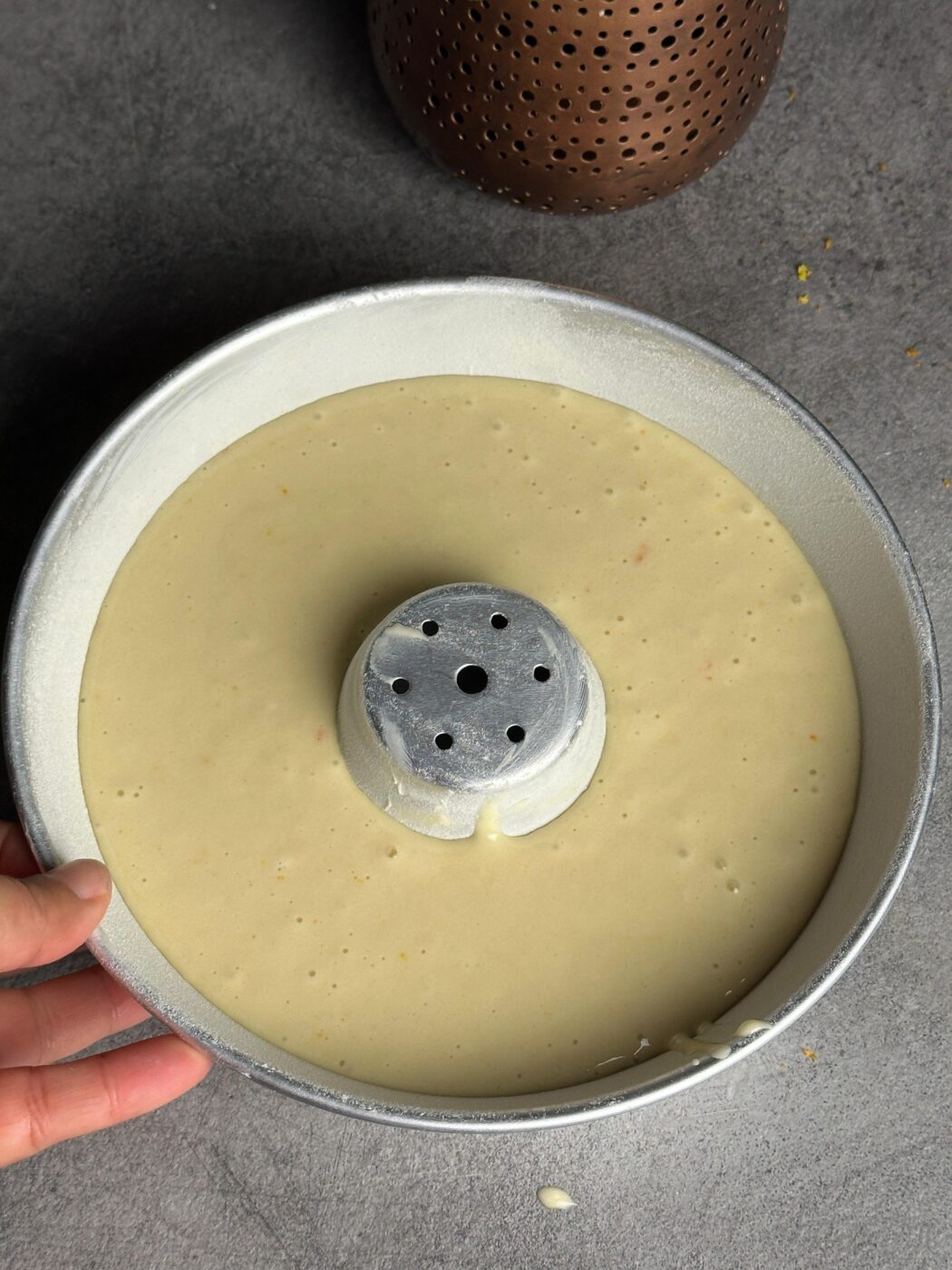 Versiamo l’impasto nello stampo pronto, aiutandoci con una paletta da cucina in silicone, una leccapentole, e poi cuociamo in forno caldo statico a 180°c per 40 minuti circa. Facciamo sempre la prova stecchino prima di sfornare, se esce asciutto allora la nostra ciambella è pronta.