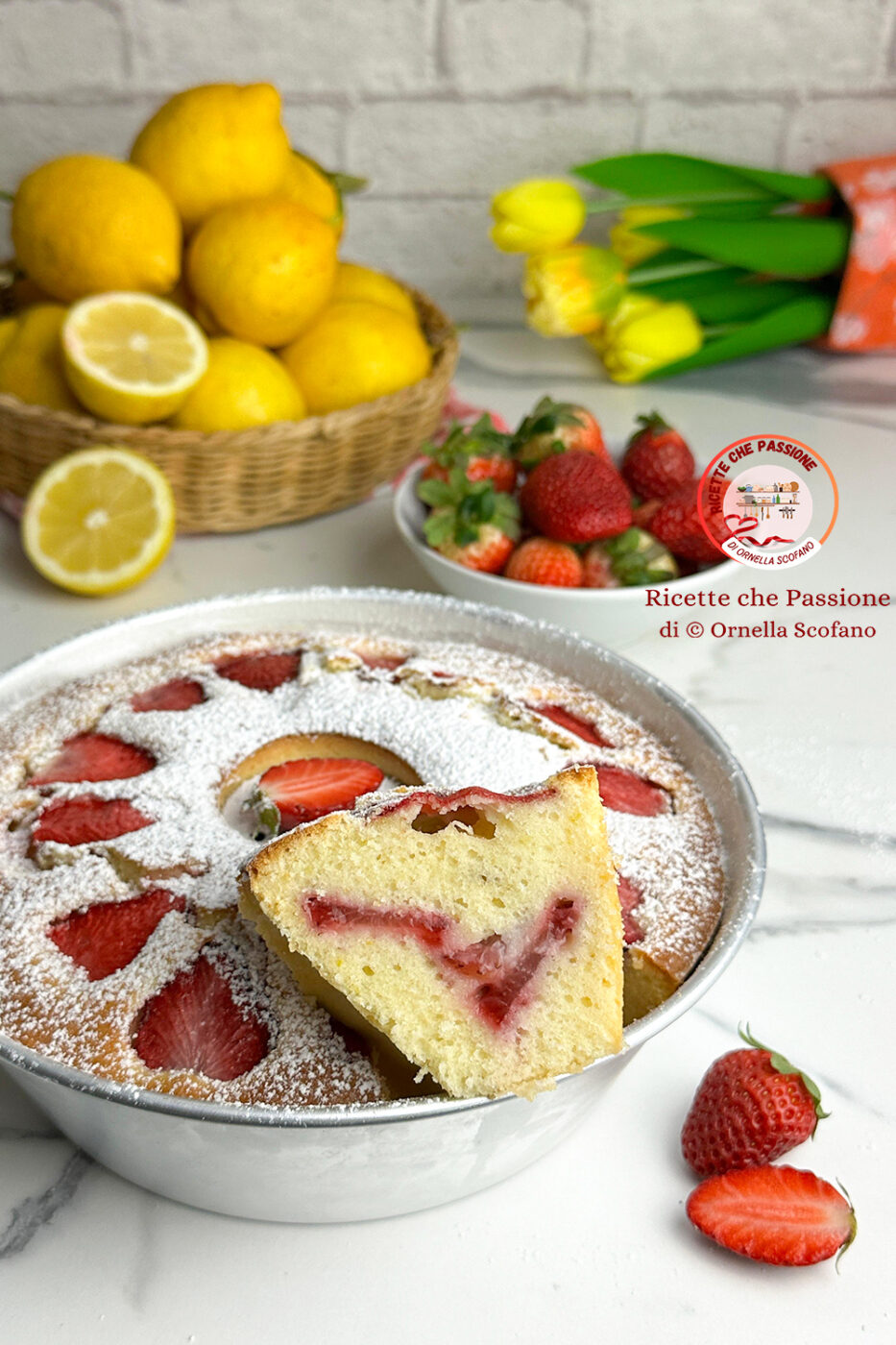 Ciambella fragole e limone, un dolce facile e veloce davvero golosissimo, con strati di fragole nell’impasto che la rendono una ciambella alla frutta davvero golosissima, umida e cremosa con un buon profumo dato dal limone fresco sia scorza che succo e le fragole fresche che cuocendo sprigionano il loro profumo che viene regalato al dolce che diventa davvero sublime. La ciambella fragole e limone è il dolce perfetto da servire a colazione ma anche a fine pasto, amabile in ogni momento della giornata. Ottima merenda per i ragazzi, sana e leggera con ingredienti da noi selezionati, senza conservanti, coloranti o altre sostanze che a lungo andare sono dannose per il nostro organismo. Ho ridotto la quantità di zucchero all’essenziale per avere un dolce bilanciato e non troppo ricco di zuccheri e calorie.