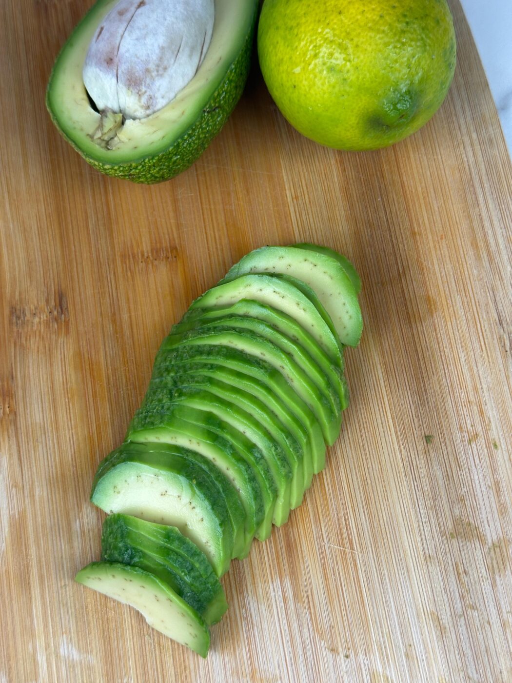 Aggiungiamo l’avocado pretrattato con succo di limone, una volta pelato e tagliato a fette sottili, così non annerisce, e non si ossida a contatto con l’aria.