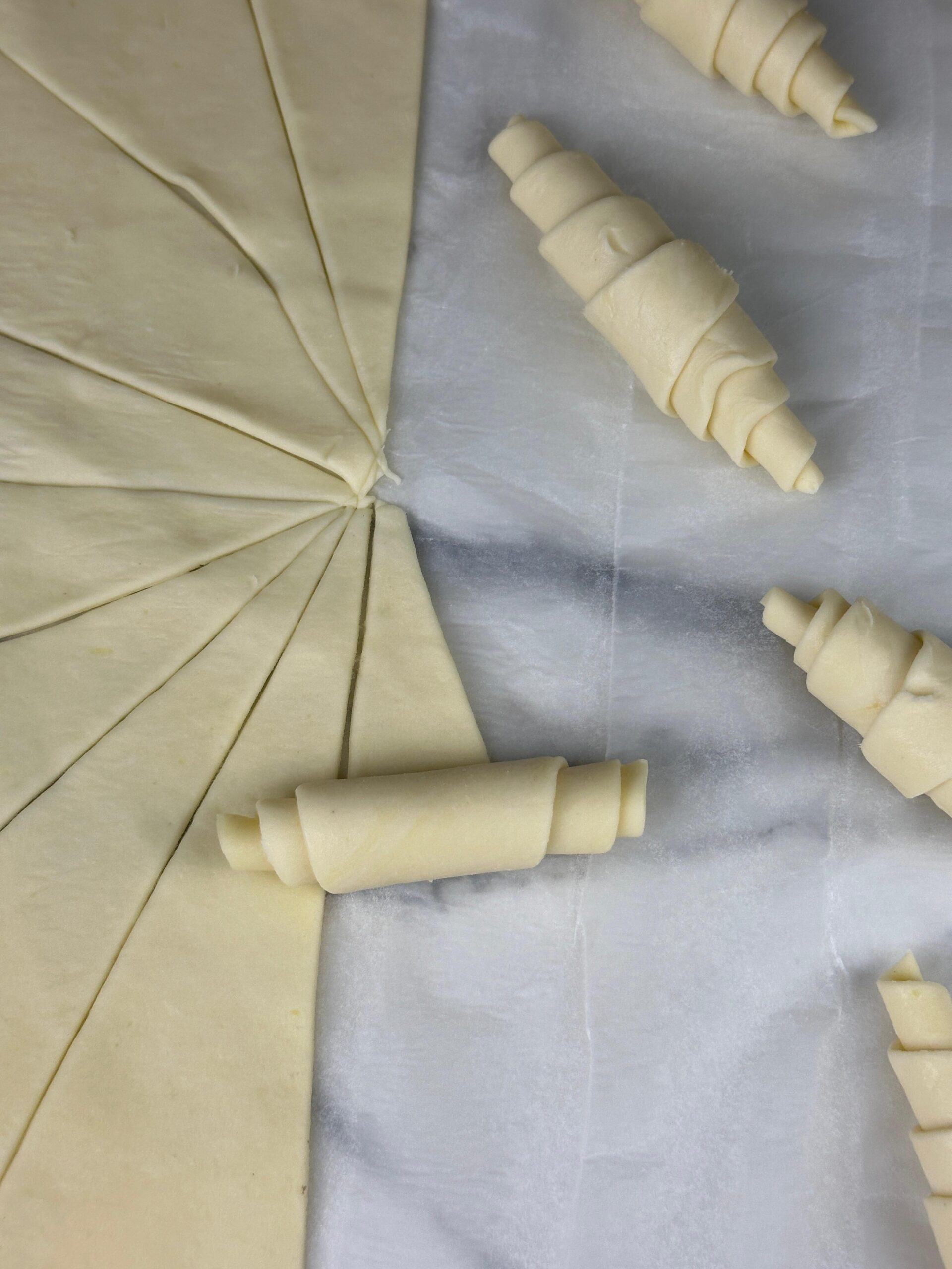 Iniziamo ad arrotolare ogni spicchio, dalla parte larga fino alla punta, ricaviamo così dei piccoli cornetti di pasta sfoglia.