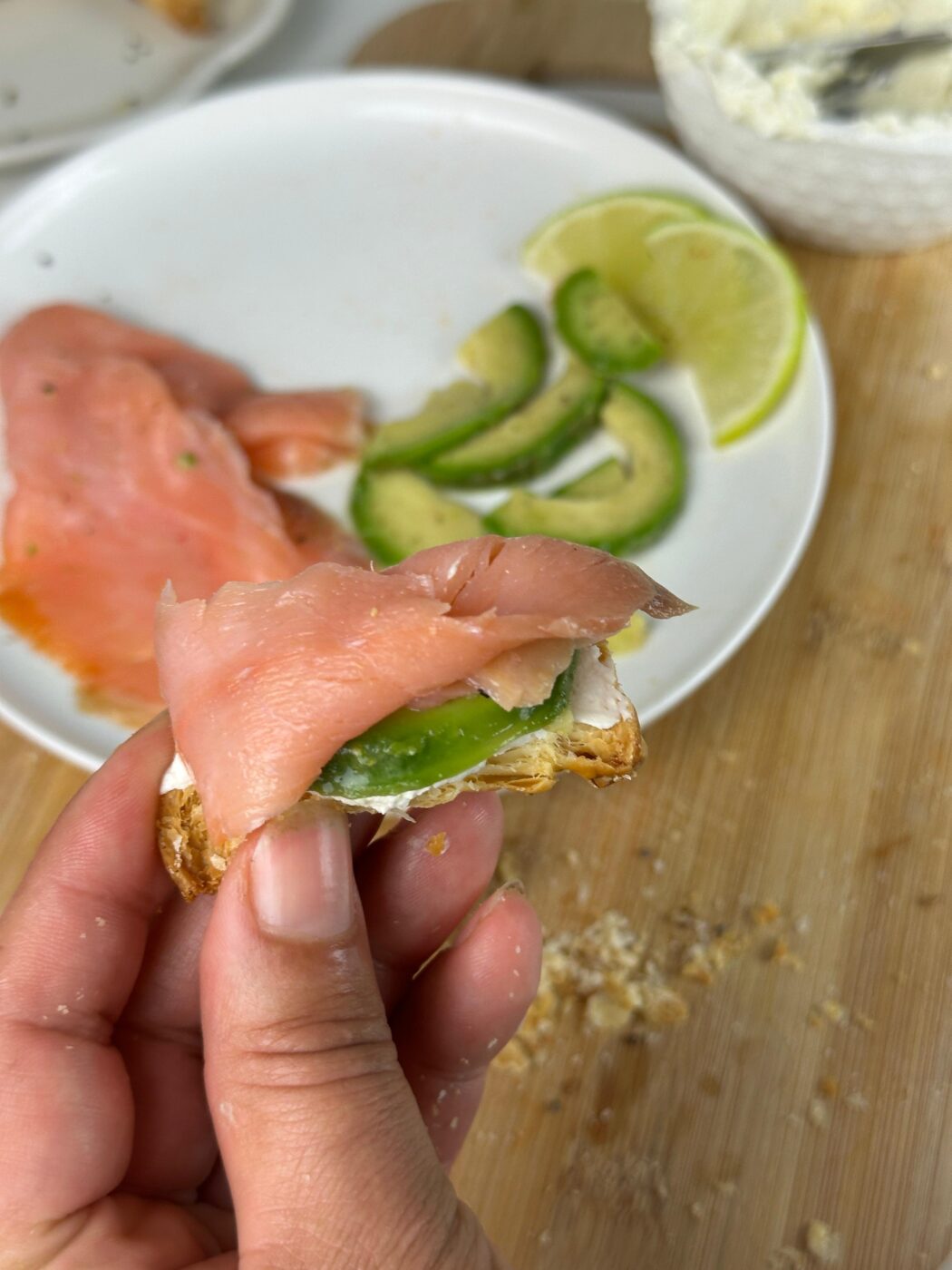 Infine aggiungiamo dei filetti di salmone affumicato, anche questi possiamo condirli a piacere con limone o lime e un po’ di pepe. Chiudiamo poi i cornetti poggiando sopra la parte tagliata del cornetto. Li mettiamo in un vassoio e li serviamo in breve tempo.