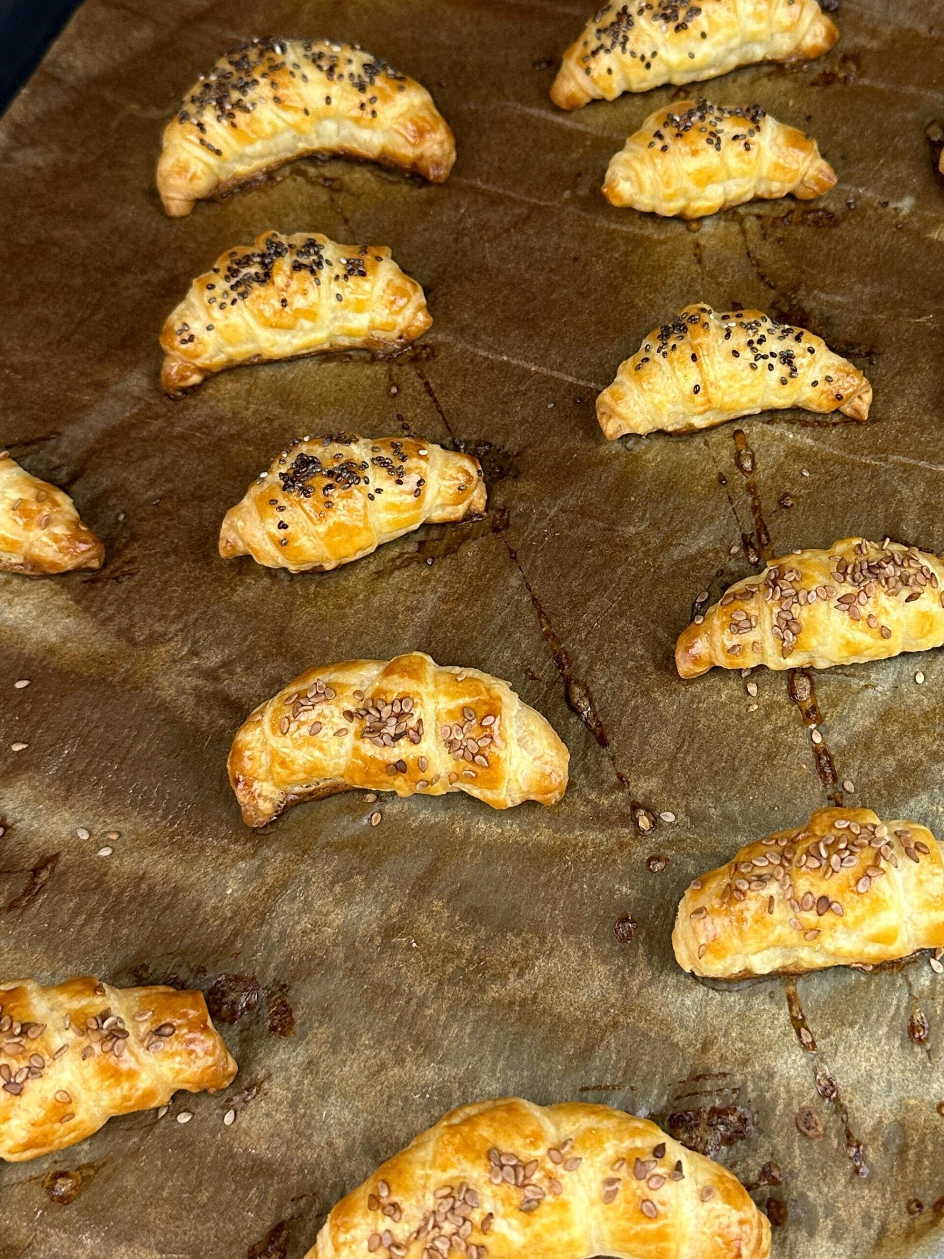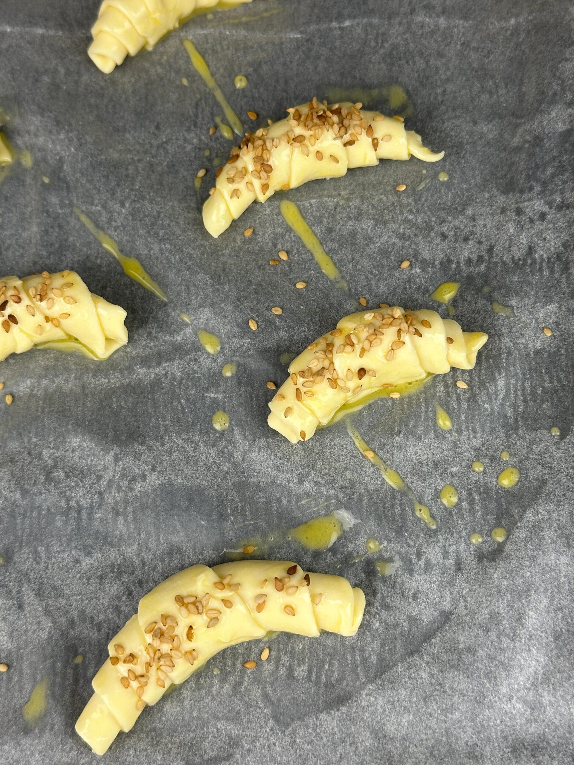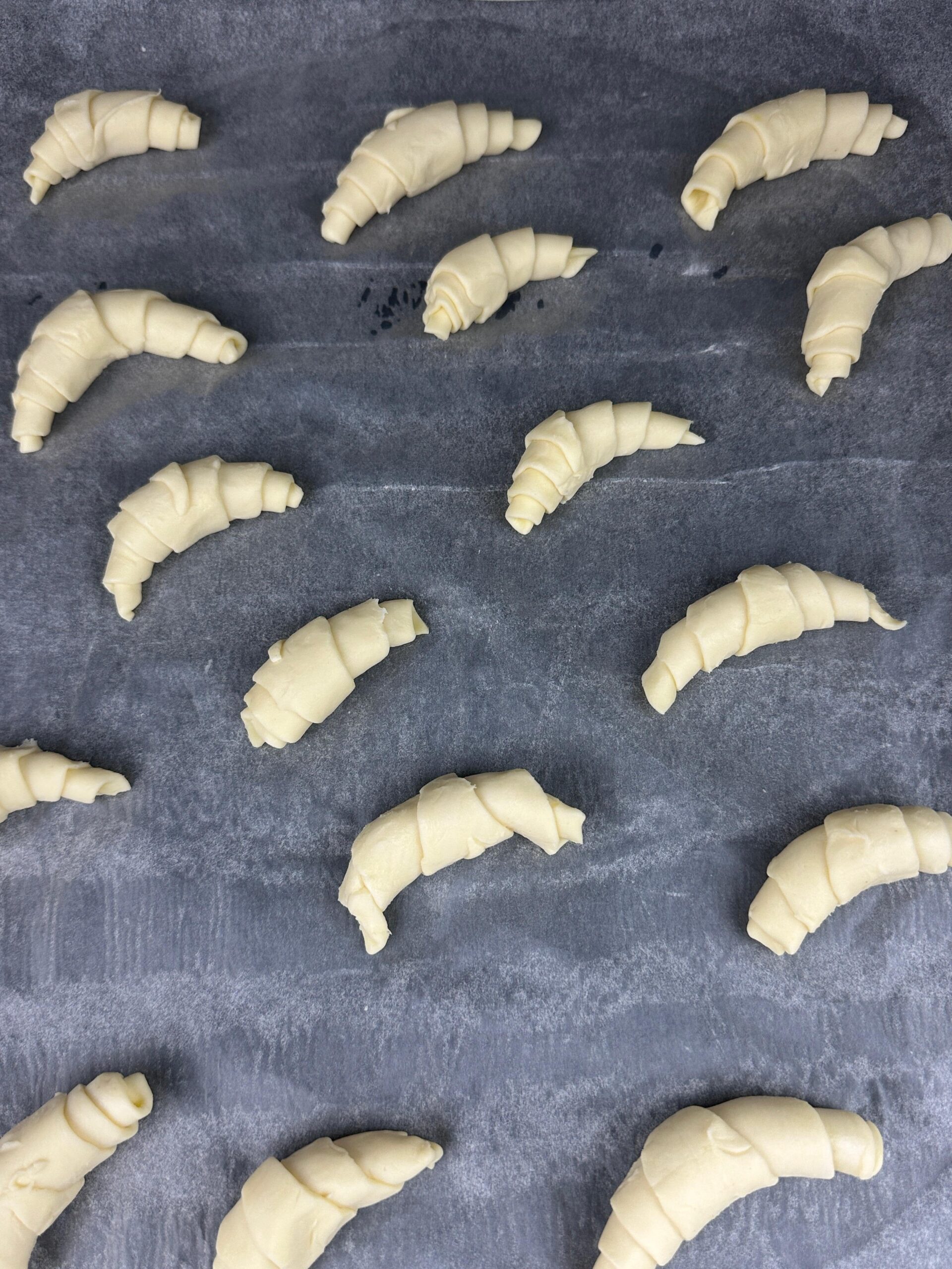 Posiamo mano a mano i cornetti pronti sulla leccarda rivestita con carta forno.