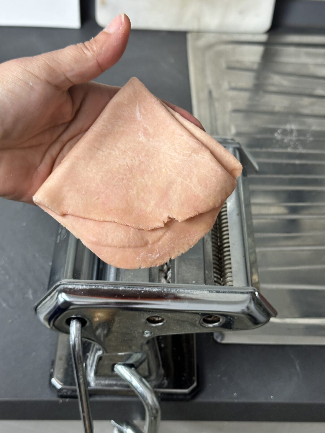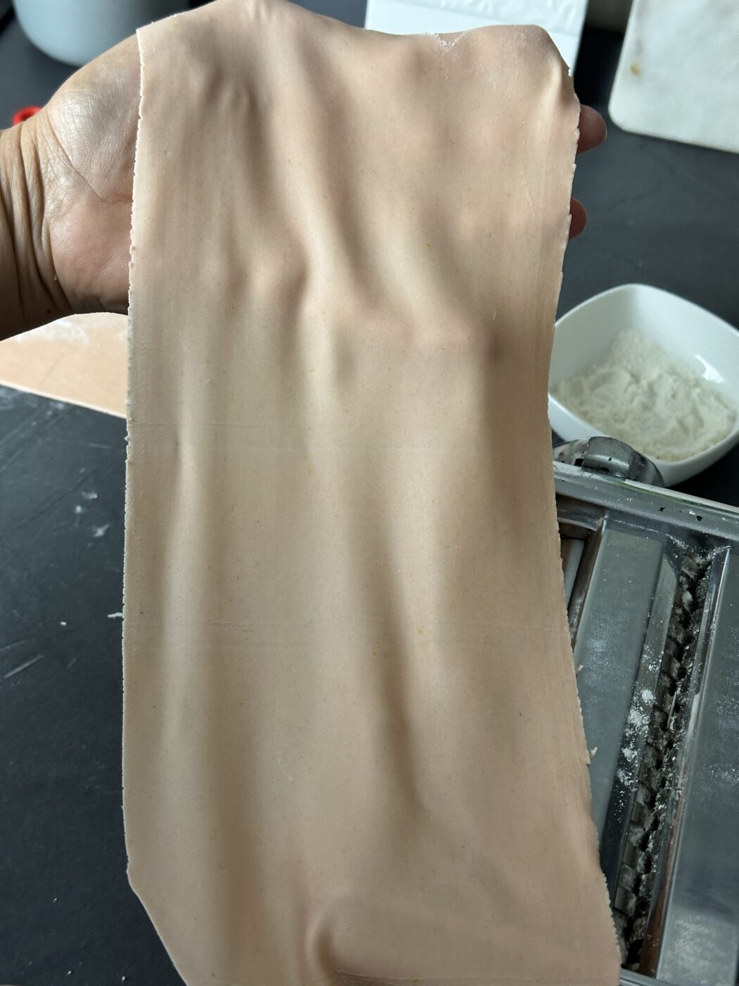 Dividiamo il panetto in almeno 6 parti e stendiamo ognuna con la macchina per la pasta, iniziamo a lavorare a rulli aperti, pieghiamo più volte la pasta al primo livello, poi quando abbiamo una sfoglia uniforme assottigliamo fino al penultimo livello, stringendo di un livello per volta i rulli. Usiamo farina se necessario.