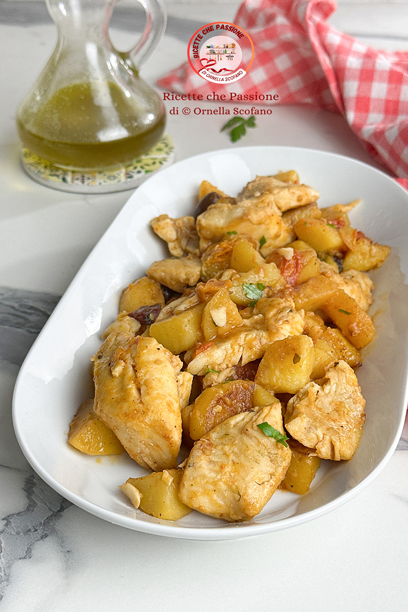 Merluzzo con patate in umido in padella, un piatto veloce da preparare e molto sfizioso, ottimo anche come piatto unico ricco e completo, perfetto per chi vuole mangiare bene, e saziarsi con un piatto buono e facile da preparare. Questa ricetta si può preparare senza problemi sia con i filetti di merluzzo freschi che surgelati, che spesso teniamo di scorta in congelatore. Nel mio freezer non mancano mai, e ogni tanto, quando ho voglia di un piatto leggero li tiro fuori e mi tolgo quella voglia che ho di mangiare pesce. Spesso non si sa come prepararli e si finisce a farli sempre allo stesso modo, magari passati in padella, o al forno con una fetta di limone. Oggi però voglio proporti una ricetta più sfiziosa, e che appaga tutti i palati, preparati in padella con patate pomodorini e olive leccino che adoro. Se vi va provatelo anche voi, sono sicura che vi piacerà.