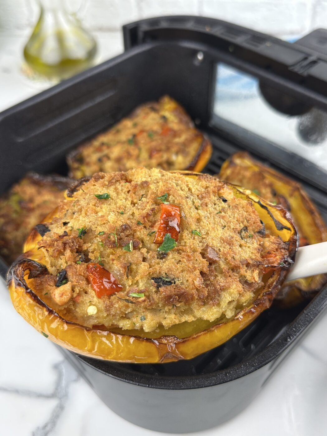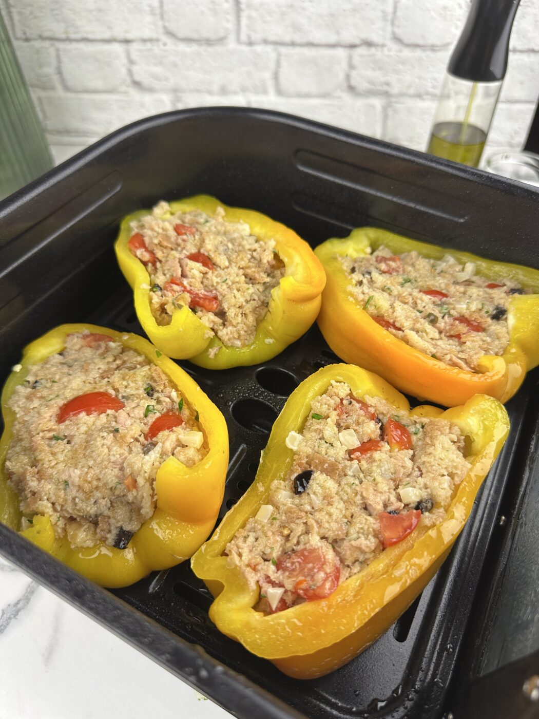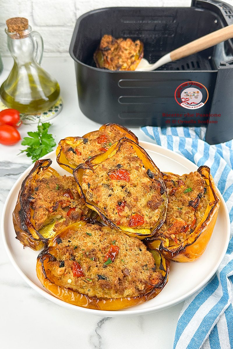 Che delizia i peperoni ripieni, ancora più buoni con questo ripieno ricco e saporito al tonno, quindi non solo con la carne. Come metodo di cottura di questi peperoni ripieni ho scelto la cottura in friggitrice ad aria, è la soluzione per chi va di fretta, o non vuole accendere il forno. Si possono anche cuocere in forno o in pentola con un goccio di acqua alla base. I peperoni ripieni si possono preparare in anticipo e servire anche freddi, perfetti per un antipasto, o aperitivo, magari trovando dei peperoni più piccoli o serviti a piccole fette. Io li ho preparati come piatto unico, e li abbiamo spazzolati a pranzo, davvero deliziosi. Se ne avanzano sono ottimi anche senza scaldarli.