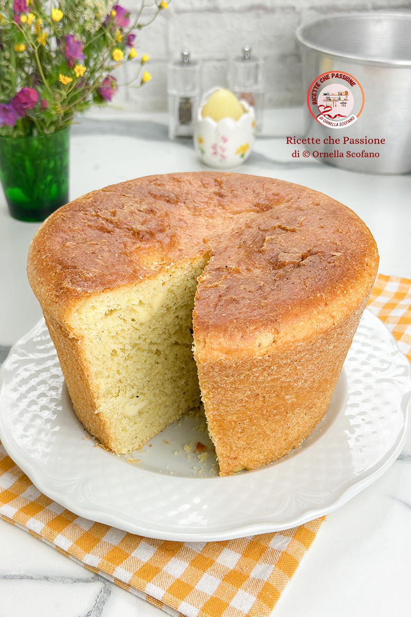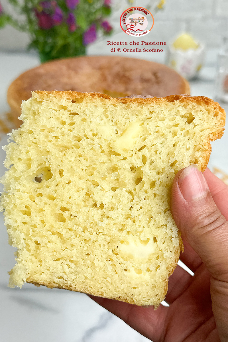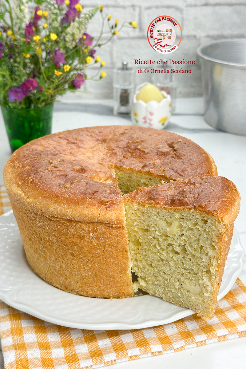 Sforniamo e lasciamo raffreddare nello stampo per un’oretta almeno, poi togliamo dallo stampo e lasciamo raffreddare completamente. Una volta fredda teniamo in un sacchetto chiuso per conservare tutta la morbidezza di come appena sfornata, una nuvola di bontà, umida e piacevole con un gusto delizioso e delicato al formaggio. Si conserva in modo ottimale per diversi giorni, perfetta per la colazione di Pasqua e Pasquestta.