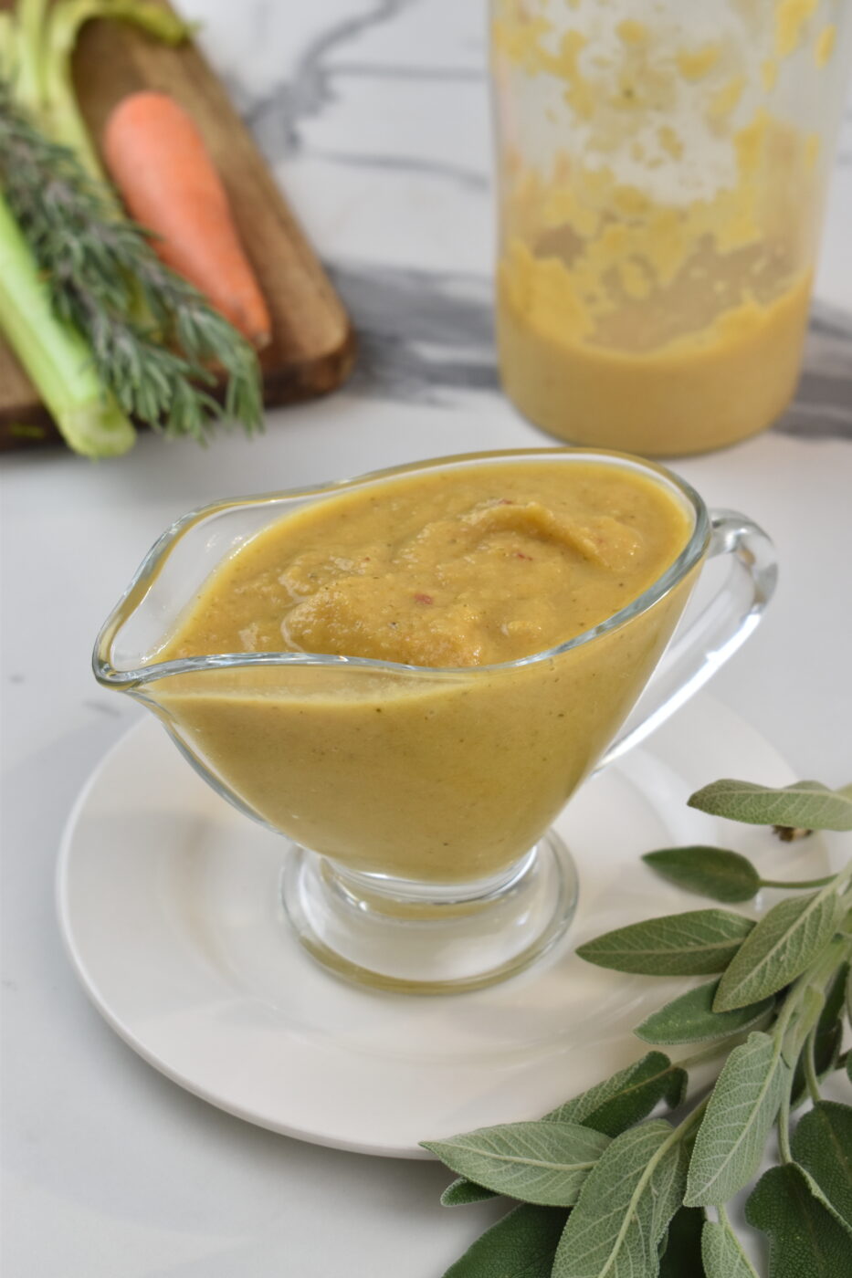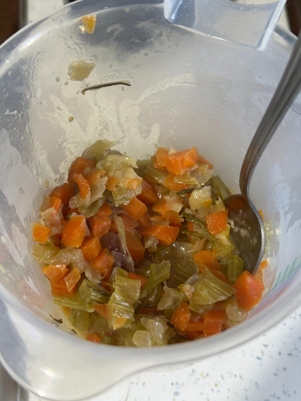 Raccogliamo il fondo di cottura e frulliamo con frullatore ad immersione per ricavare la salsa di accompagnamento, che è una salsa davvero deliziosa e leggera con tutte le verdure saporite dalla cottura della tacchino.
