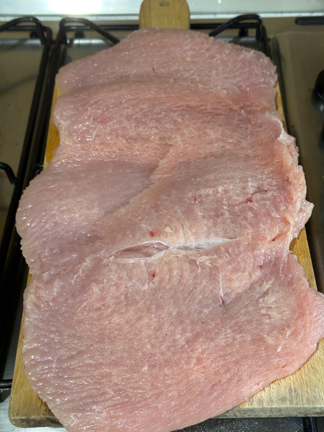 Intanto apriamo la fesa di tacchino, ad ottenere una fetta ampia. La battiamo con un batticarne su un tagliere, in modo da assottigliarla un po’ e renderla ancora più tenera.