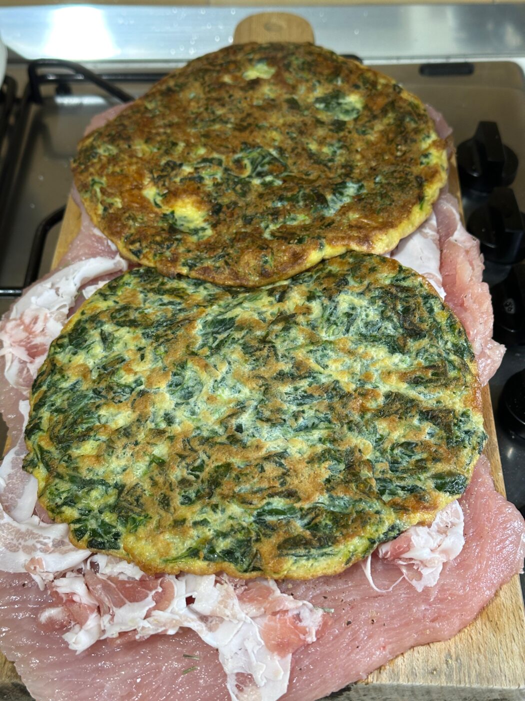 Prepariamo in una ciotola la frittata con gli spinaci e le uova, con poco sale pepe e parmigiano, mescoliamo con una forchetta e cuociamo in due frittatine, in padella da circa 22 cm di diametro, io in quella per crepes, con poco olio alla base, giusto il necessario per ungere la padella antiaderente.