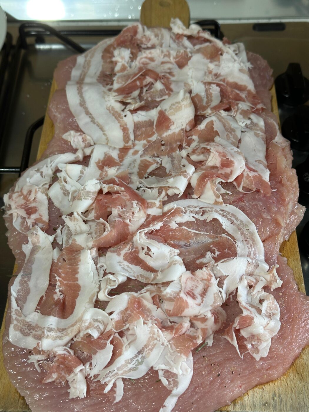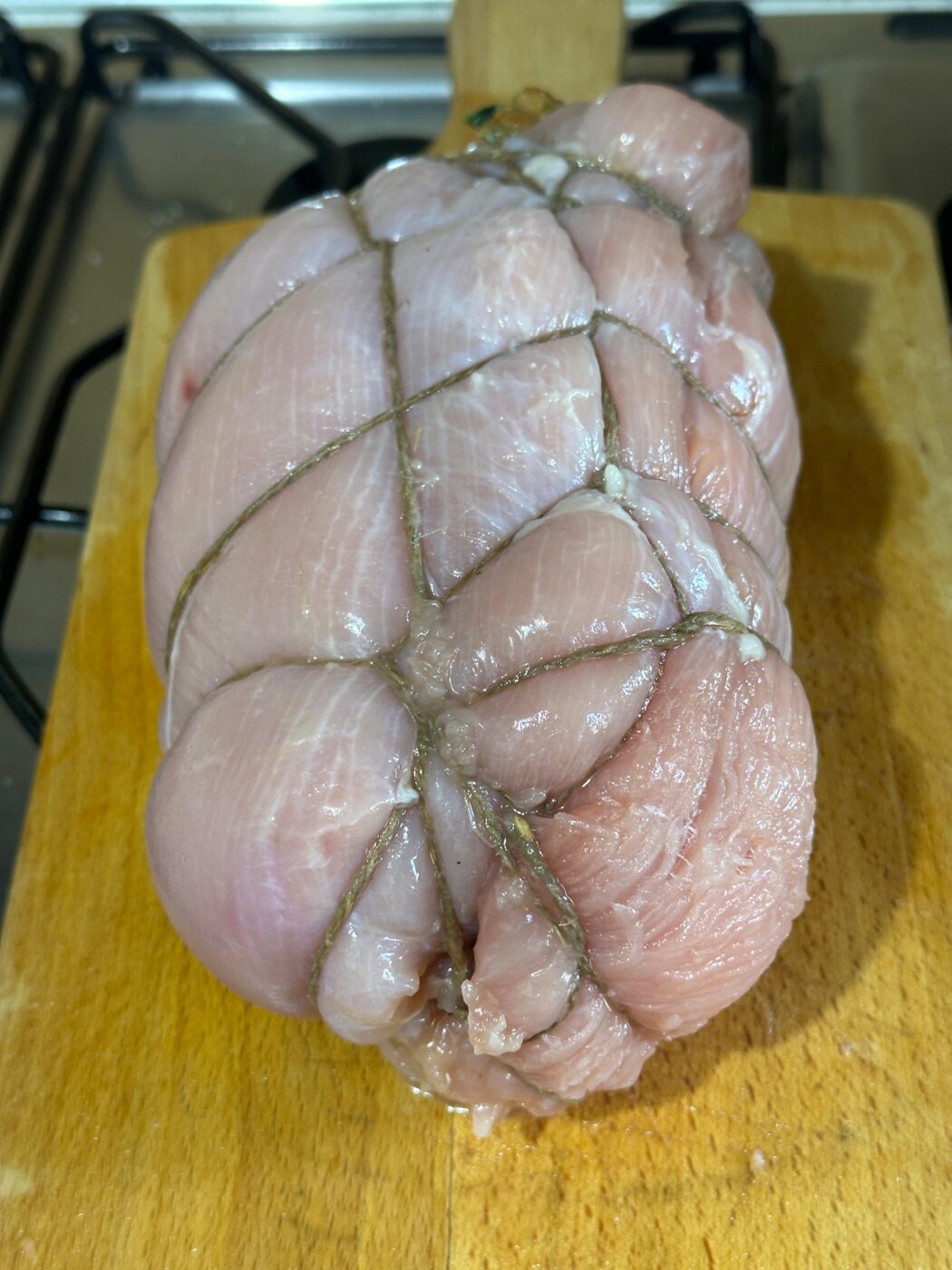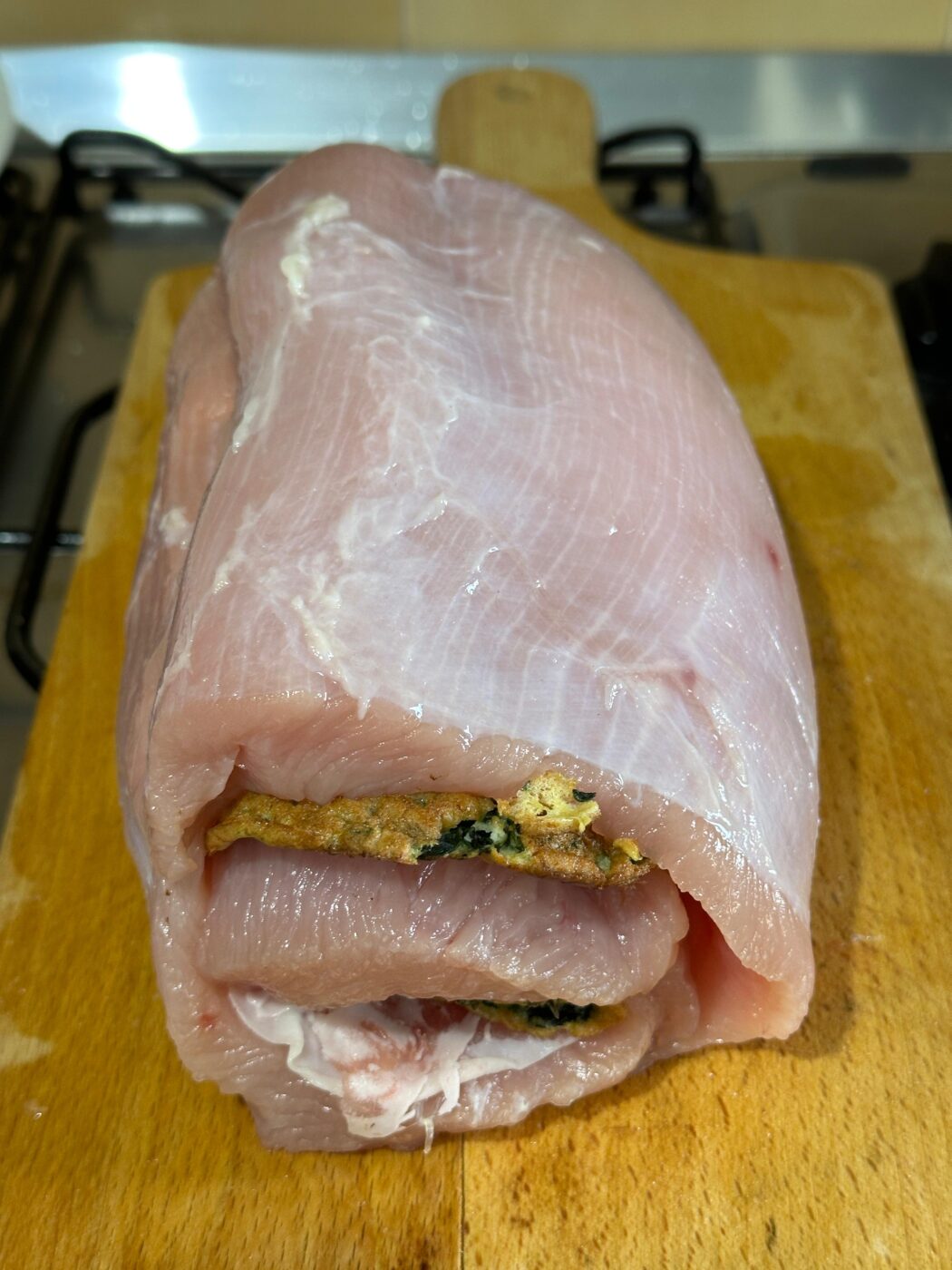 Farciamo la fetta di tacchino condita con la pancetta arrotolata, e infine con le frittate intiepidite. A questo punto arrotoliamo dal lato più corto. Leghiamo bene con spago da cucina, tipo un arrosto, cercando di chiudere bene il ripieno all’interno, come un bel salamino.
