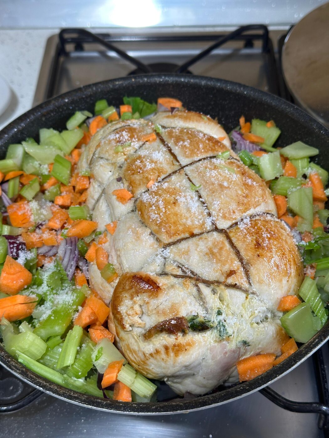 Aggiungiamo in padella a cubetti carote, sedano e cipolle, tritate in modo grossolano a coltello su un tagliere. Aggiungiamo ancora un pizzico di sale e infine il vino. Copriamo con coperchio e cuociamo a fuoco baso per circa 40-45 minuti, a metà cottura lo giriamo. Si può verificare la cottura dopo 35 minuti con un termometro da cucina, quando arriva al cuore a 75°c è pronto. Mi Raccomando non cuocetelo troppo altrimenti si asciuga troppo.