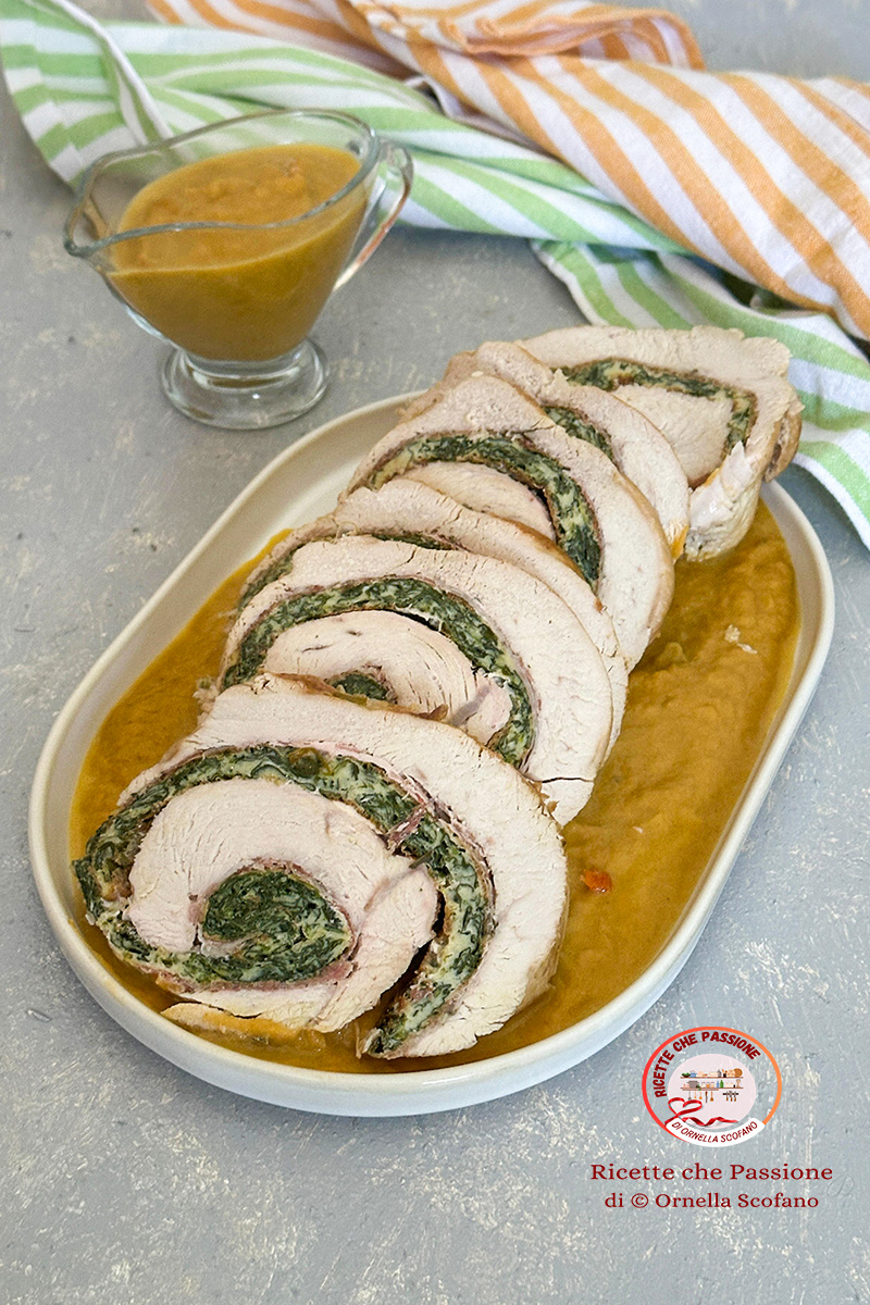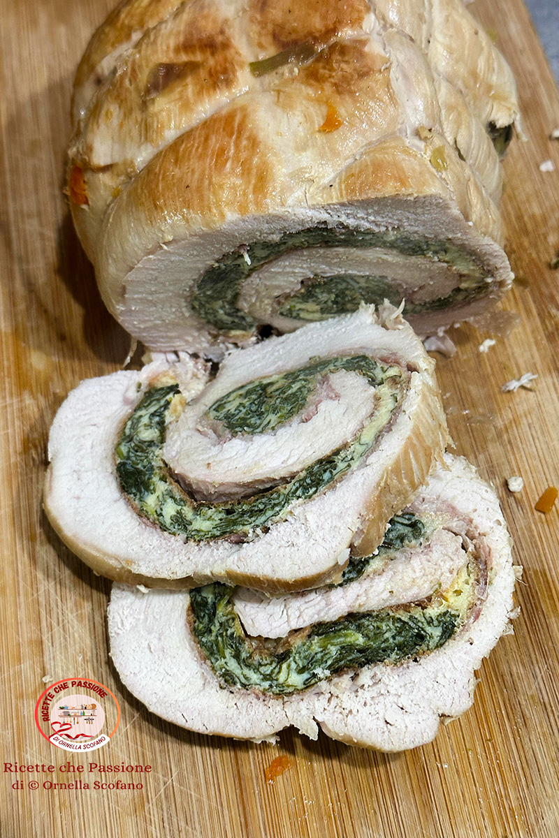 Rotolo di tacchino farcito e porti in tavola qualcosa di sfizioso, facile da preparare ed è davvero buonissimo, cotto in padella, senza forno. Per Pasqua non avevo idea di cosa cucinare, poi mi sono ricordata che avevo in congelatore un bel pezzo di fesa di tacchino, ne volevo fare un arrosto per il pranzo della domenica, a casa i miei lo adorano, e così lo faccio spesso, solo che ultimamente è difficile da trovare, così anche se non ne avevo immediato bisogno una volta in macelleria, e trovatolo, me ne sono fatta dare un bel pezzo, e l’ho congelato. Così mi sono ritrovata per l’occasione un bel pezzo da circa kg 1,2, mi è bastato scongelarlo, lentamente dalla sera prima in frigo, e verso le 10 di mattina mi sono messa a lavoro per prepararlo, tanto è molto facile da preparare ed anche veloce. Vediamo come farlo sarà perfetto per le prossime occasioni, è davvero delizioso, ed è tenerissimo, si taglia con la forchetta.