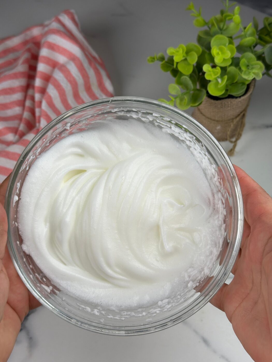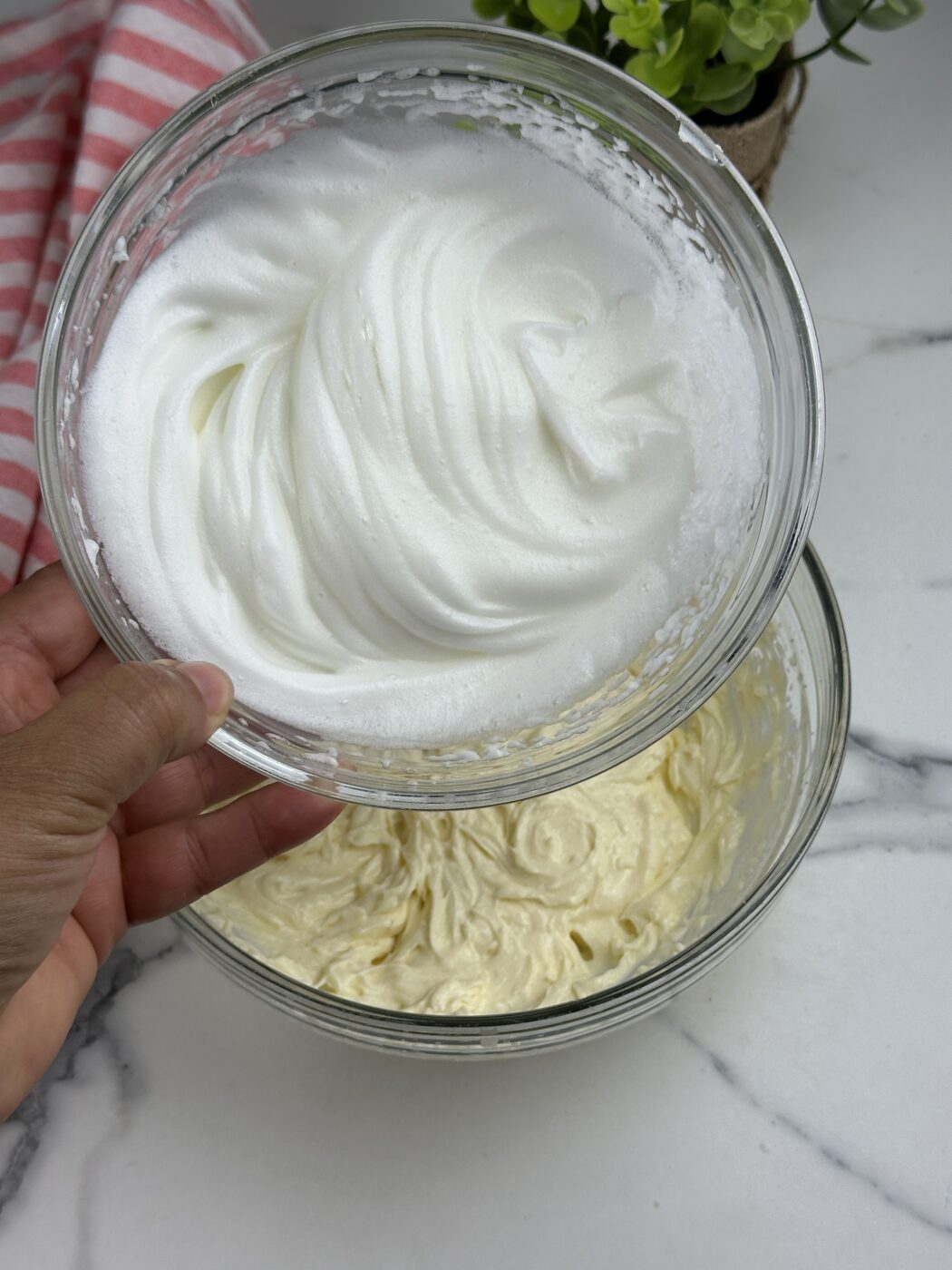Incorporiamo gli albumi poco per volta alla crema di mascarpone con una spatola, con movimenti dal basso verso l’alto.