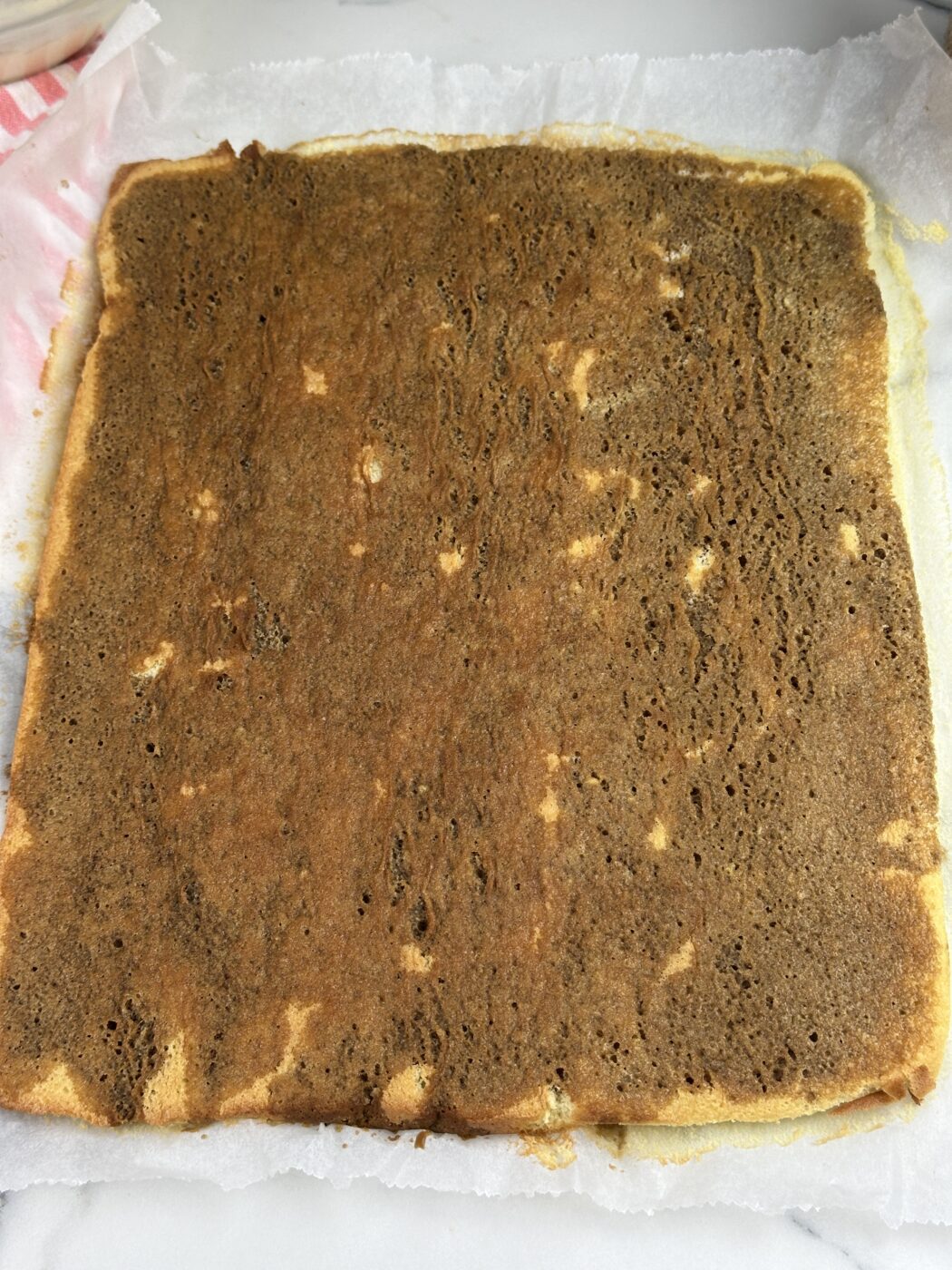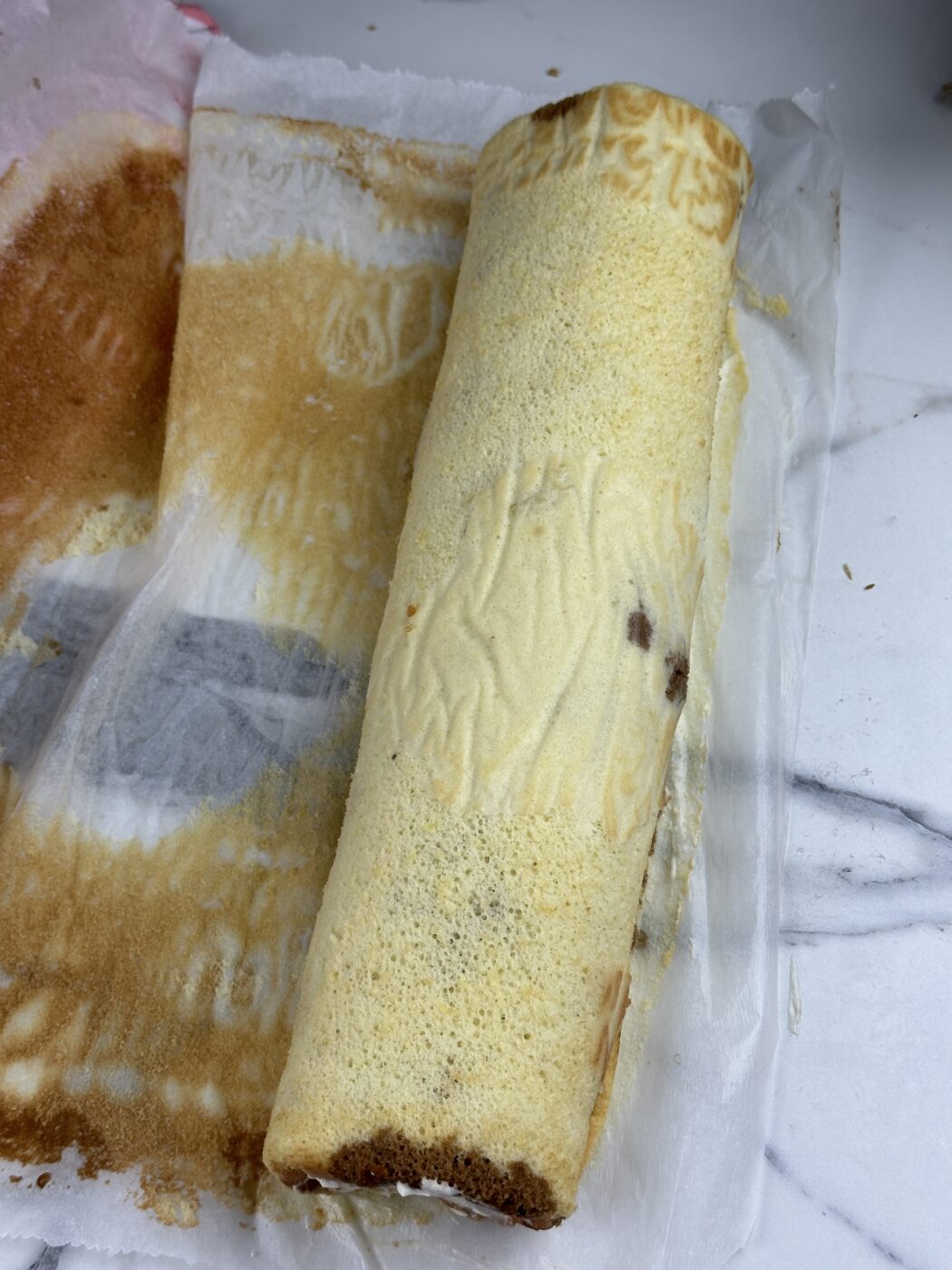 Sforniamo, arrotoliamo, senza stringere troppo, con la stessa carta forno, e chiudiamo in un canovaccio. Mettiamo in un angolo fresco in modo da farlo raffreddare velocemente.