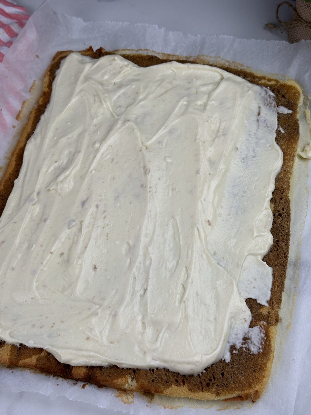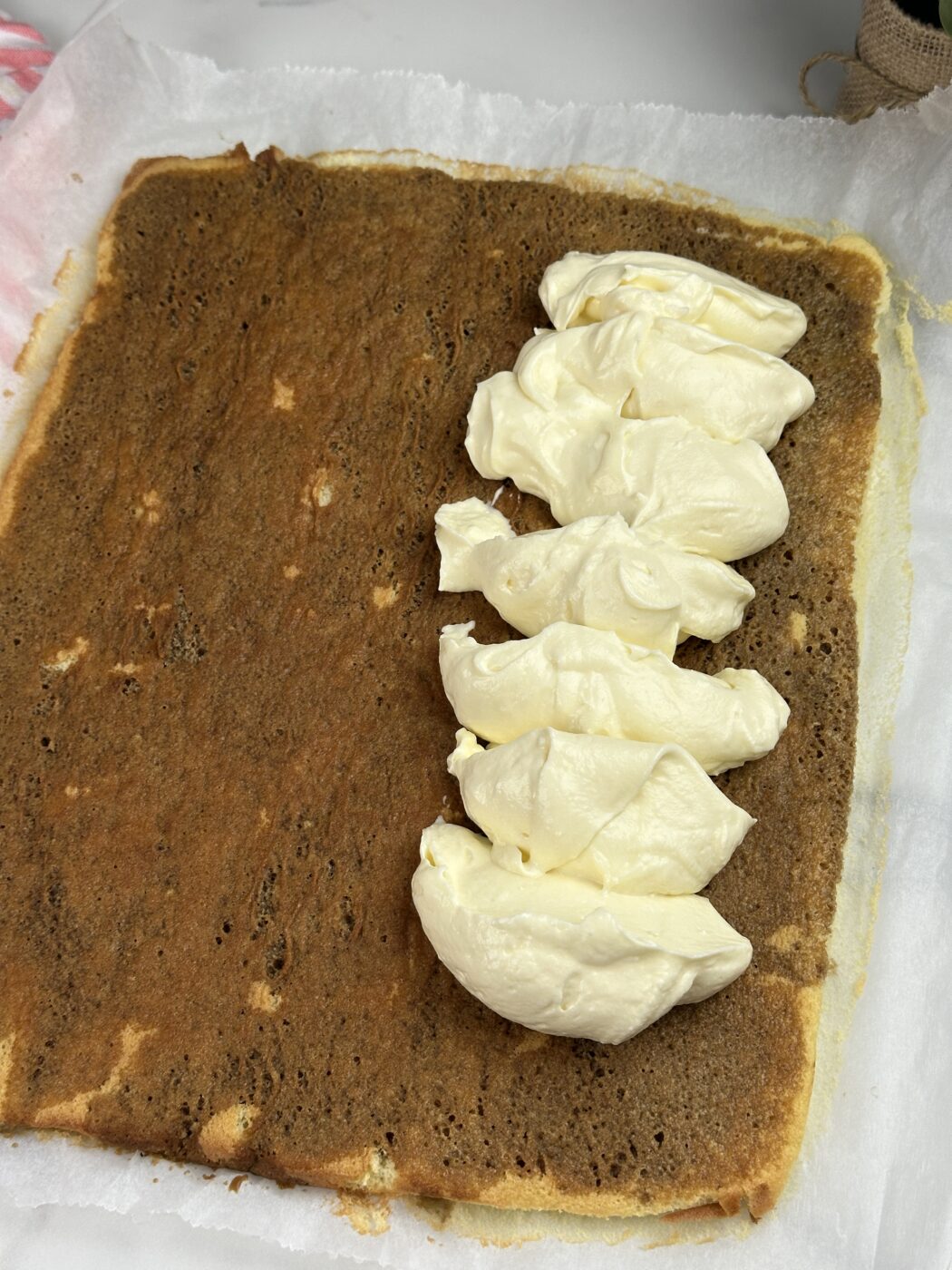 Se la pasta biscotto è fredda la srotoliamo, la bagniamo con la miscela di caffè, distribuendolo su tutta la superficie, e poi farciamo con tutta la crema la base, lasciando libera la parte finale del rotolo, così si chiuderà facilmente senza eccessiva fuoriuscita di crema.