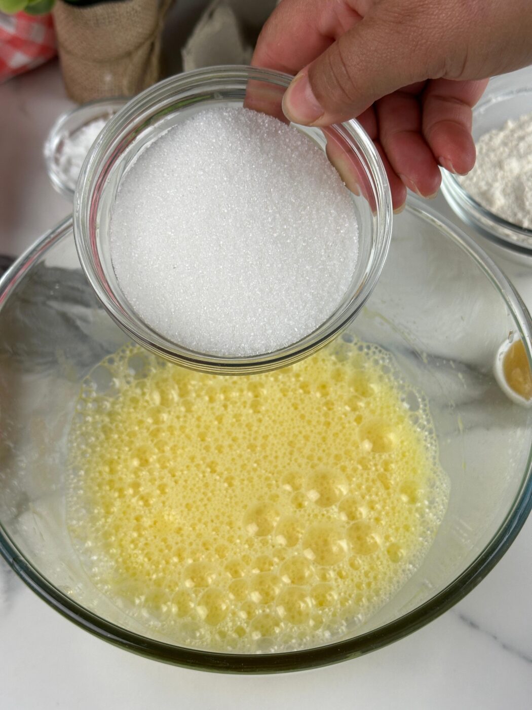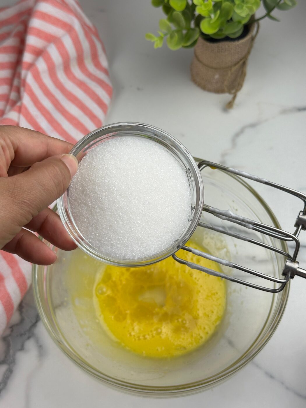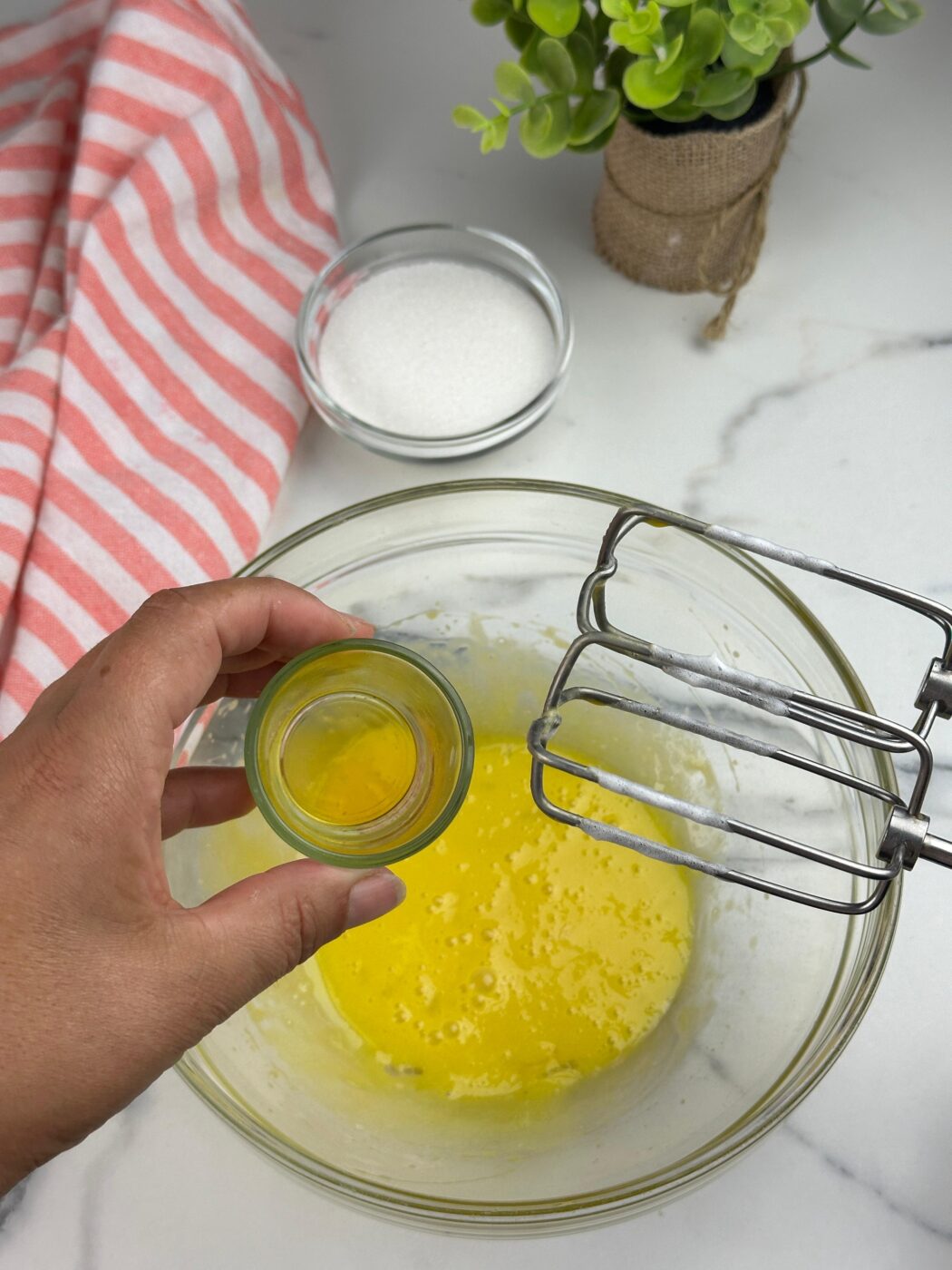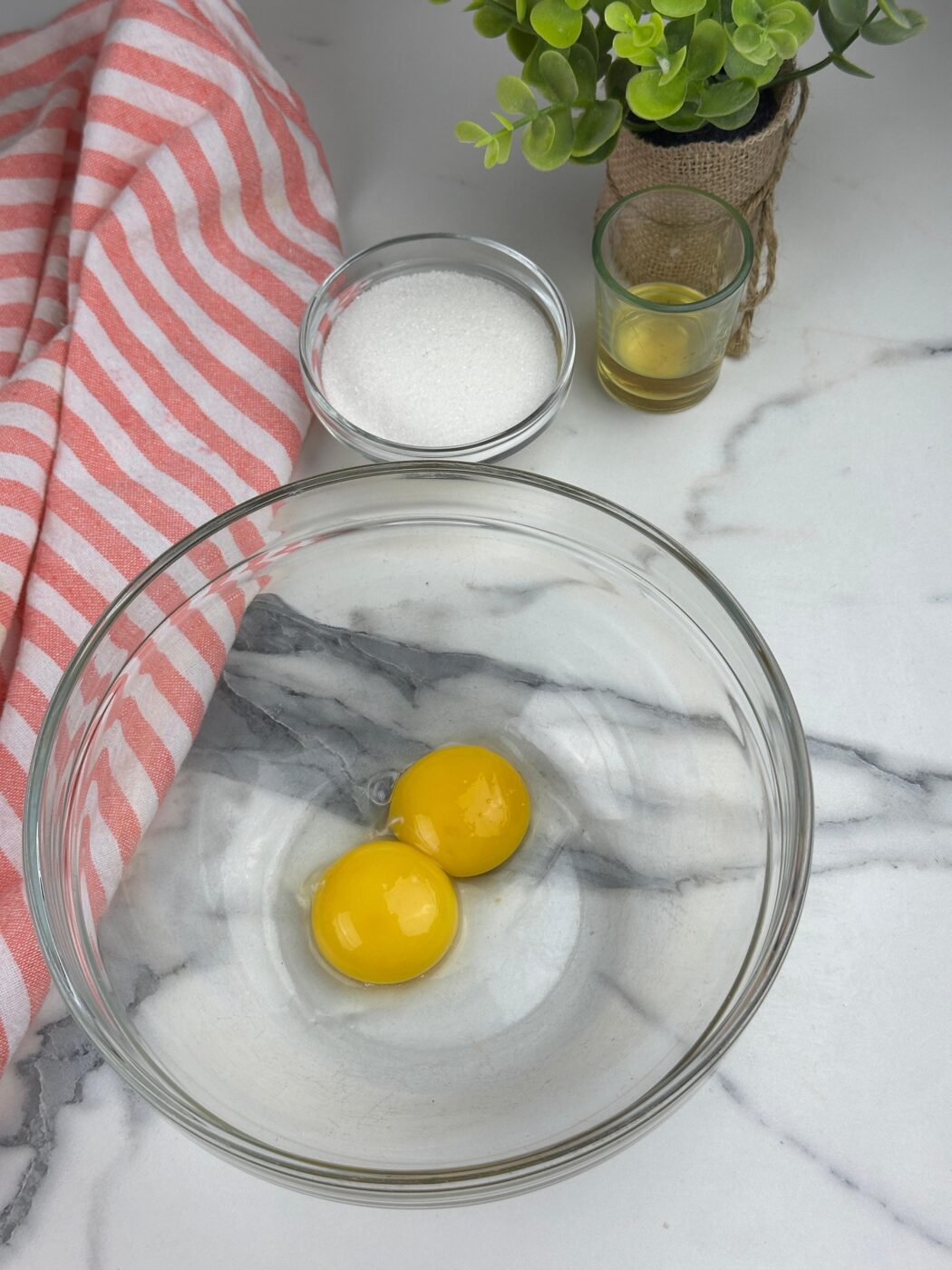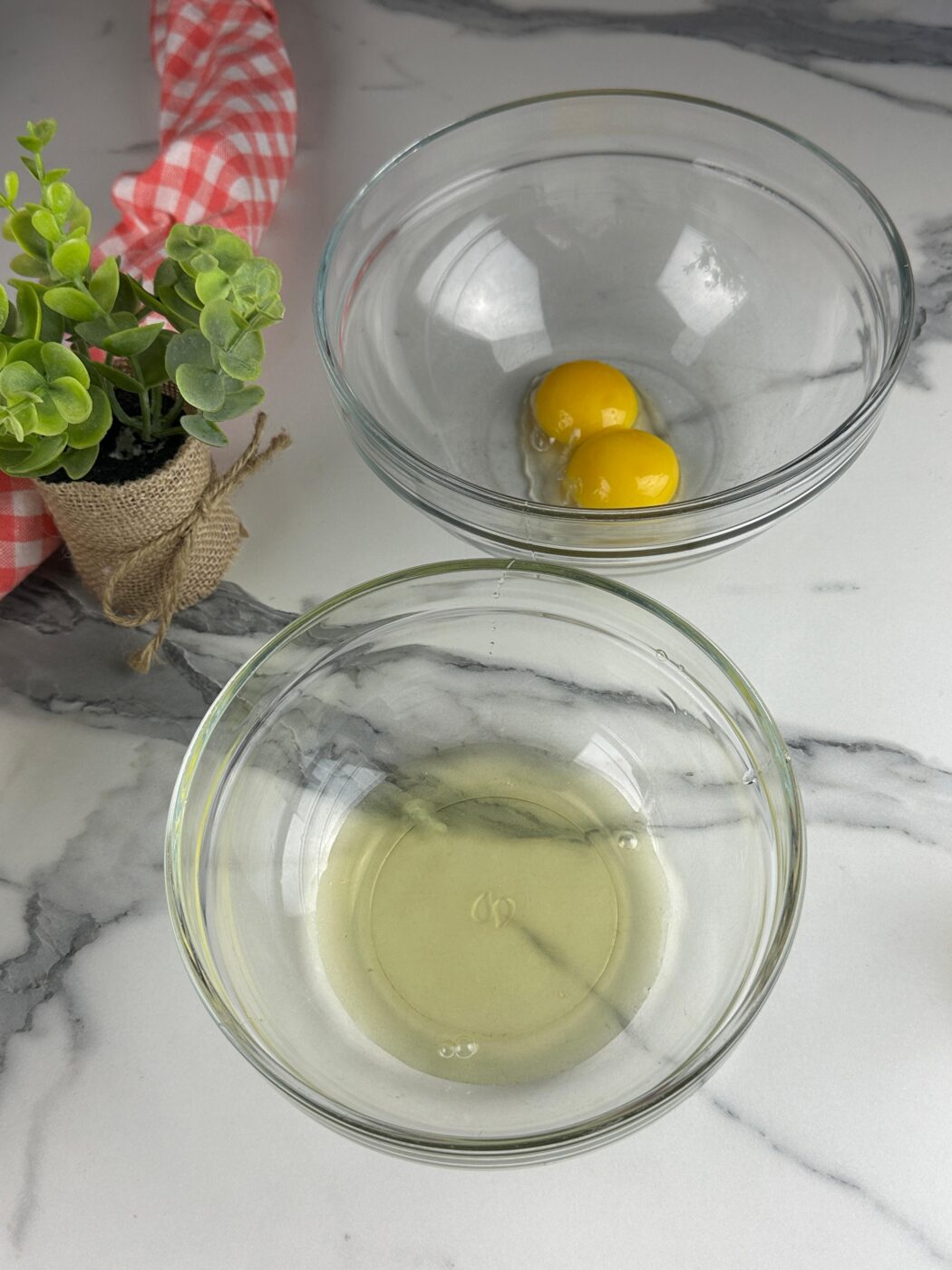 Separiamo i tuorli dagli albumi e mettiamo in 2 ciotole capienti. Montiamo con le fruste elettriche pulite prima gli albumi a neve ben ferma, girando la ciotola non devono cadere.