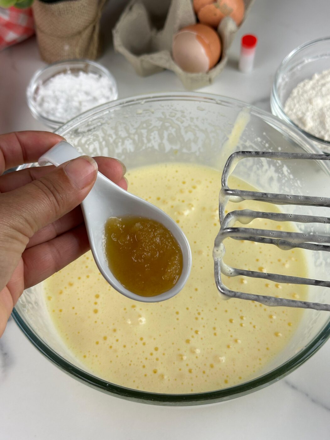 In una ciotola mettiamo le uova e lo zucchero, montiamo con le fruste elettriche alla massima velocità per circa 5 minuti, fino ad ottenere un composto gonfio, chiaro e spumoso. Aggiungiamo il miele e mescoliamo ancora. A questo punto possiamo mettere da parte le fruste elettriche.