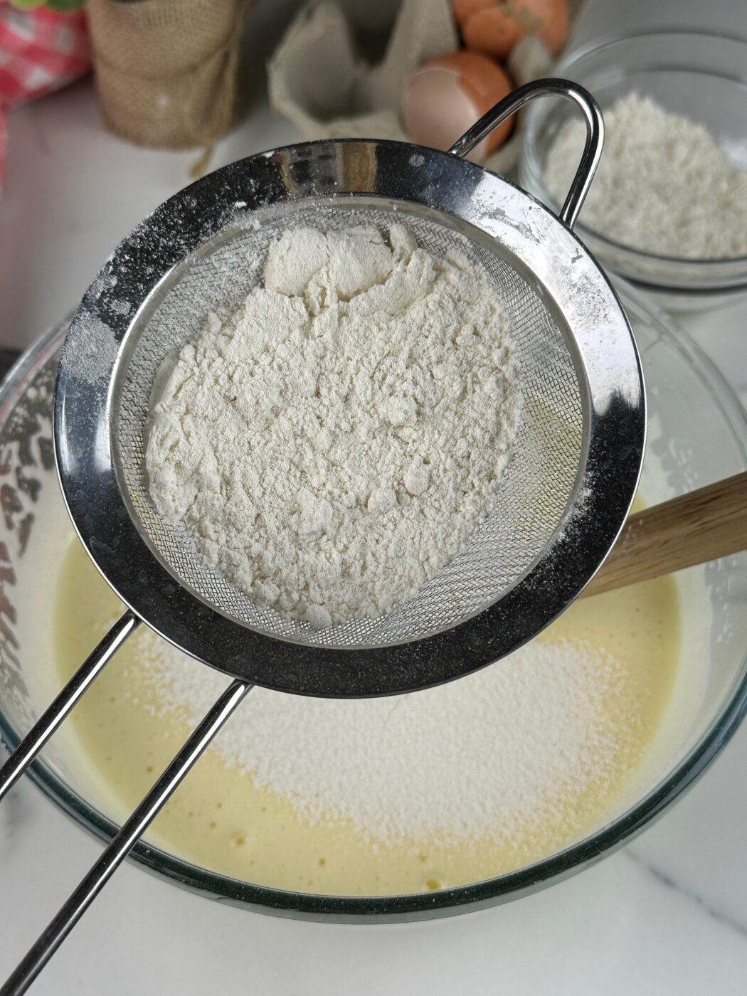 Aggiungiamo la farina e la fecola setacciati poco per volta e li incorporiamo con una paletta con movimenti delicati dal basso verso l’alto per non smontare le uova con lo zucchero. Aggiungiamo infine anche la vaniglia.