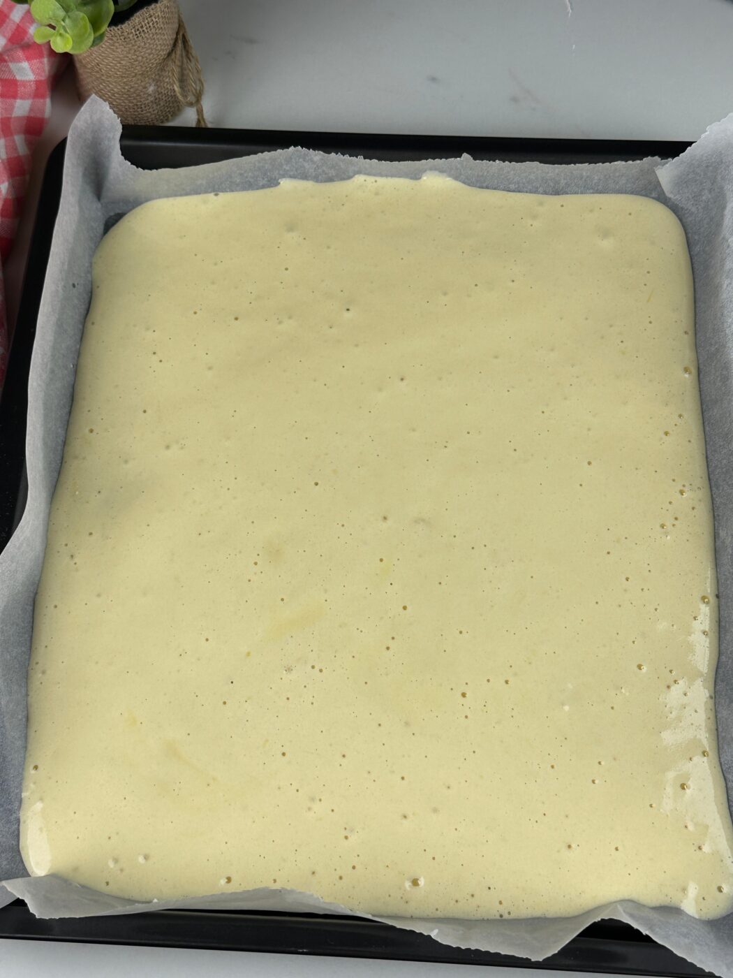 Iniziamo a preparare la pasta biscotto. Prepariamo subito una teglia 30×40 rivestita con carta forno. Per non far scivolare la carta bagniamo la teglia con acqua. Dopo aver già dosato gli ingredienti e procurato il necessario accendiamo il forno a 180°c statico.