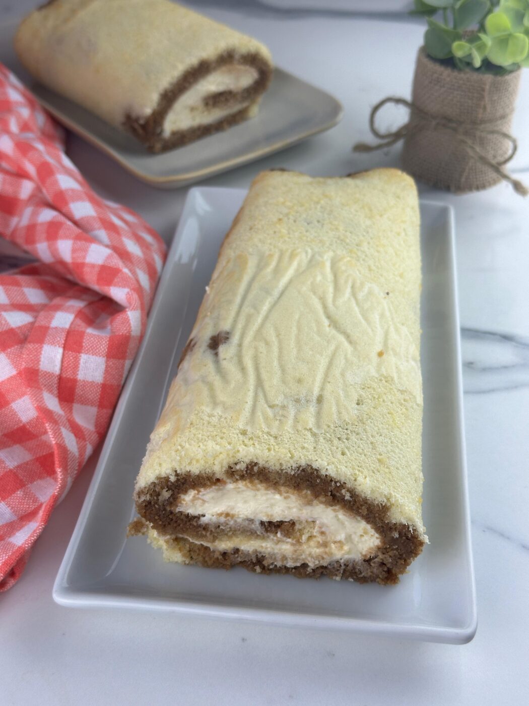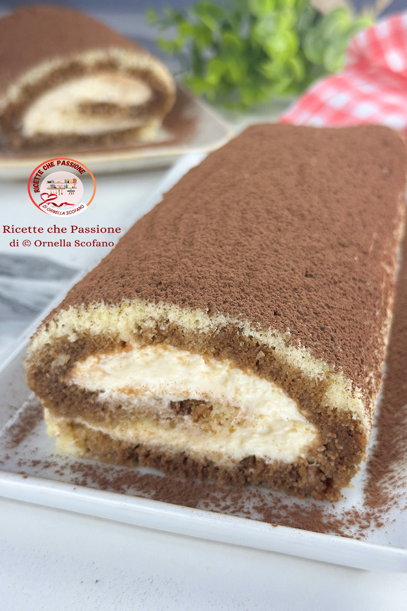Rotolo tiramisù facile veloce e buonissimo con pasta biscotto perfetta che non si spezza, senza grassi e senza lievito, perfetto da trasformare per Natale in un delizioso tronchetto. Amo da impazzire la pasta biscotto, molto simile al pan di spagna, io cambio poco per renderla più elastica, diminuisco la quantità di zucchero e farina e aggiungo un ingrediente che rende la pasta biscotto più resistente ma lasciandola allo stesso tempo morbida, e soffice. Per il rotolo tiramisù ho usato una bagna al caffè, un buon caffè alla caffettiera diluito con un po’ di latte, altrimenti poi resto insonne, non essendo abitua a bere più di un caffè al giorno. Per la crema la classica crema al mascarpone, io non uso pastorizzare le uova, non mi han mai creato problemi le uova crude, ma preferisco usare quelle controllate del supermercato, non quelle del pollaio, che uso solo cotte, perchè lì non c’è alcun controllo e quindi potrebbero essere contaminate. Ovviamente so che tu vorrai anche poter pastorizzare le uova, per avere la sicurezza di uova non crude. Per pastorizzare le uova con sicurezza puoi seguire la cottura a bagnomaria mentre le monti con lo zucchero, questo è l’unico metodo davvero sicuro, ti lascio qui il link come pastorizzare le uova in modo sicuro. Una volta pastorizzate le uova, lavorando direttamente uova e zucchero, dovrai aggiungere il mascarpone.