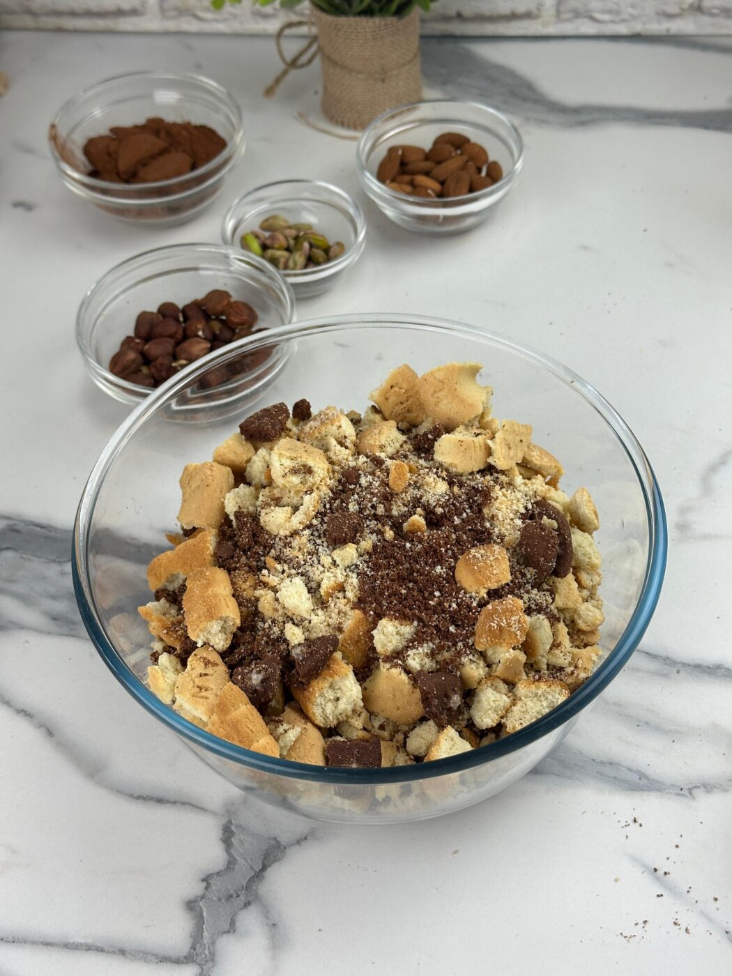 Mettiamo in una ampia ciotola i biscotti e aggiungiamo la frutta secca. Possiamo già aggiungere il cacao, la cannella e il liquore, un bel bicchierino abbondante, di quelli piccoli.