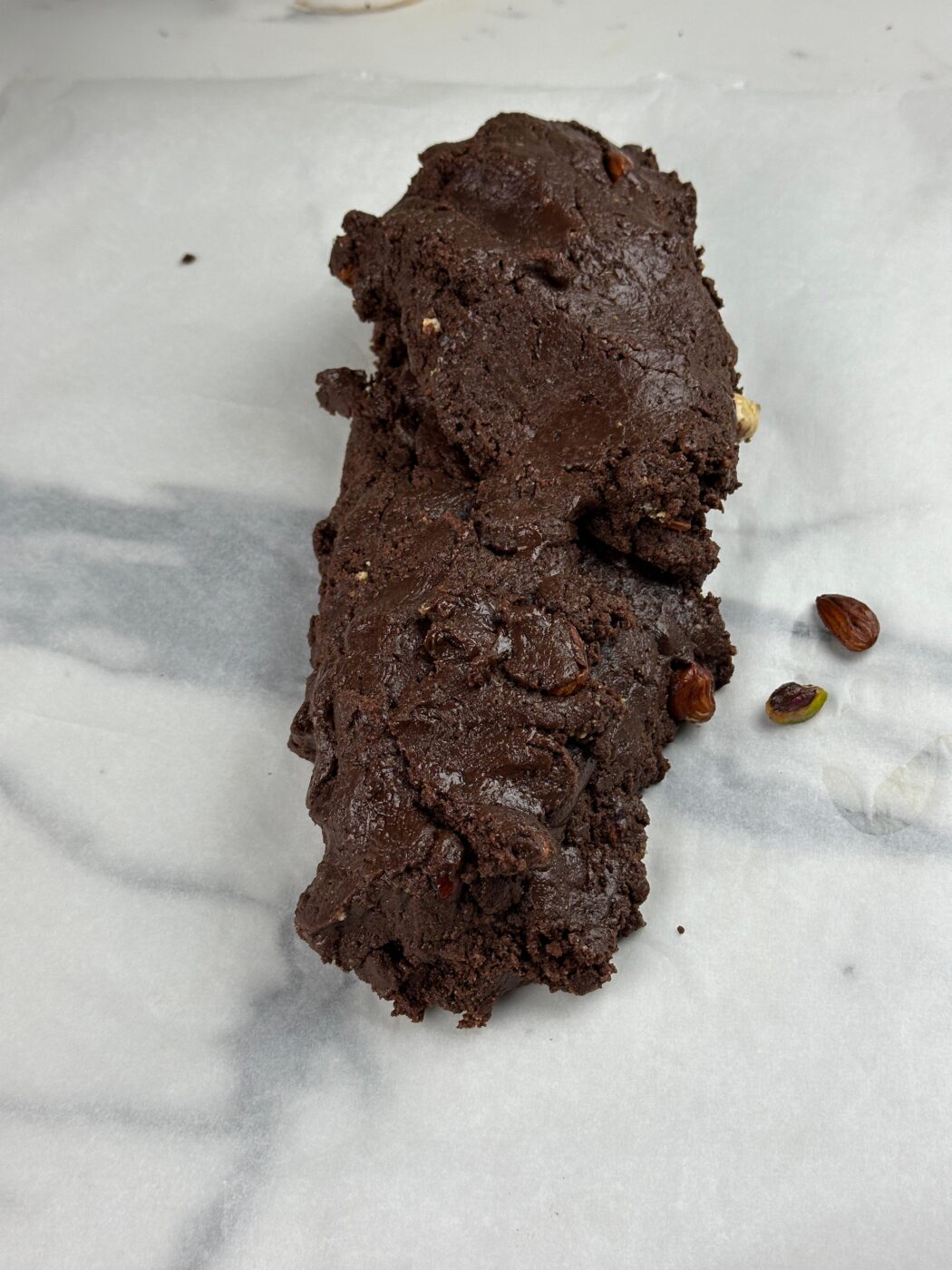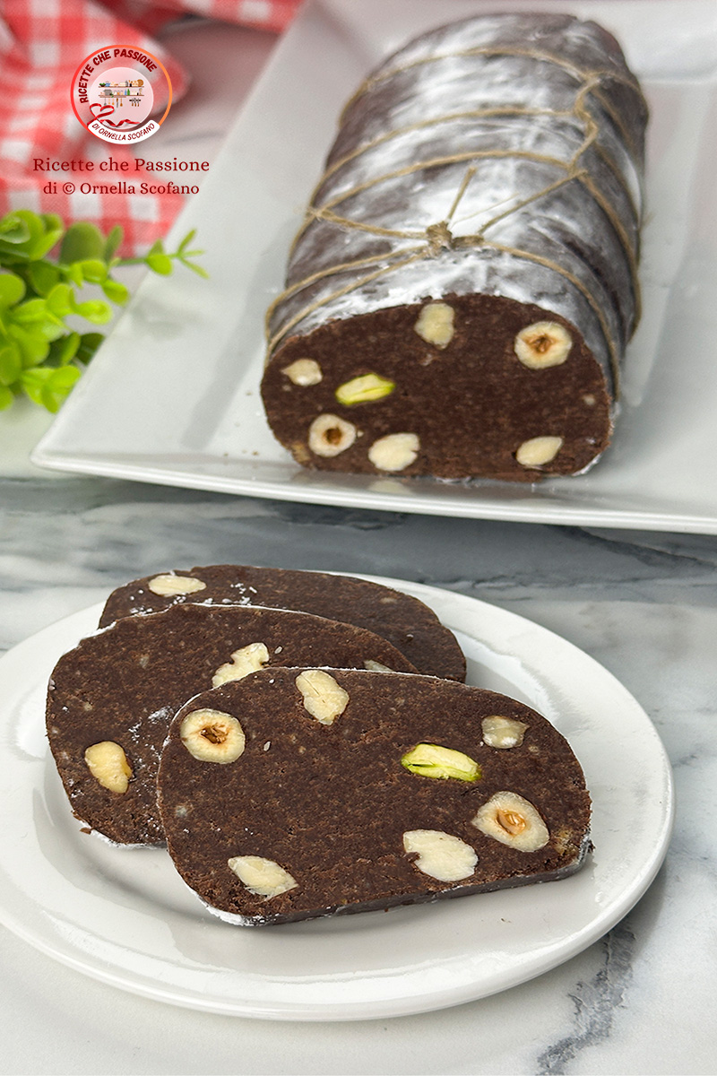 Su un foglio di carta forno diamo forma al salame di cioccolato, ottenuto un bel salame lo chiudiamo nella carta forno e lasciamo rassodare in frigo qualche ora.