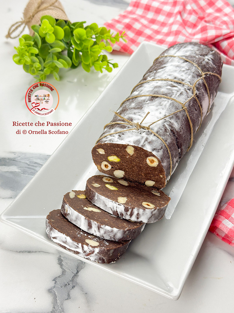 Salame al cioccolato preparato senza burro con latte condensato e frutta secca, aromatizzato con cannella e amaretto, facile da fare e va letteralmente a ruba, infatti ha un difetto, crea dipendenza. Preparare il salame al cioccolato al latte condensato è facilissimo, e richiede pochi ingredienti, base di biscotti, macinati e lavorati insieme con latte condensato, cioccolato sciolto e liquore, nel mio caso amaretto. Io ho dato un buon aroma di amaretto, ma va bene anche un altro liquore, tipo rum, o liquore all’arancia. Ho aggiunto anche abbondante cacao e cannella, per dargli un gusto più intenso, e devo dire che la scelta è stata azzeccata, col senno di poi, avrei potuto aggiungere delle scorzette di arancia candite, quelle che preparo in casa e che sono buonissime, sarebbe state ottime nell’insieme, peccato non averci pensato prima.