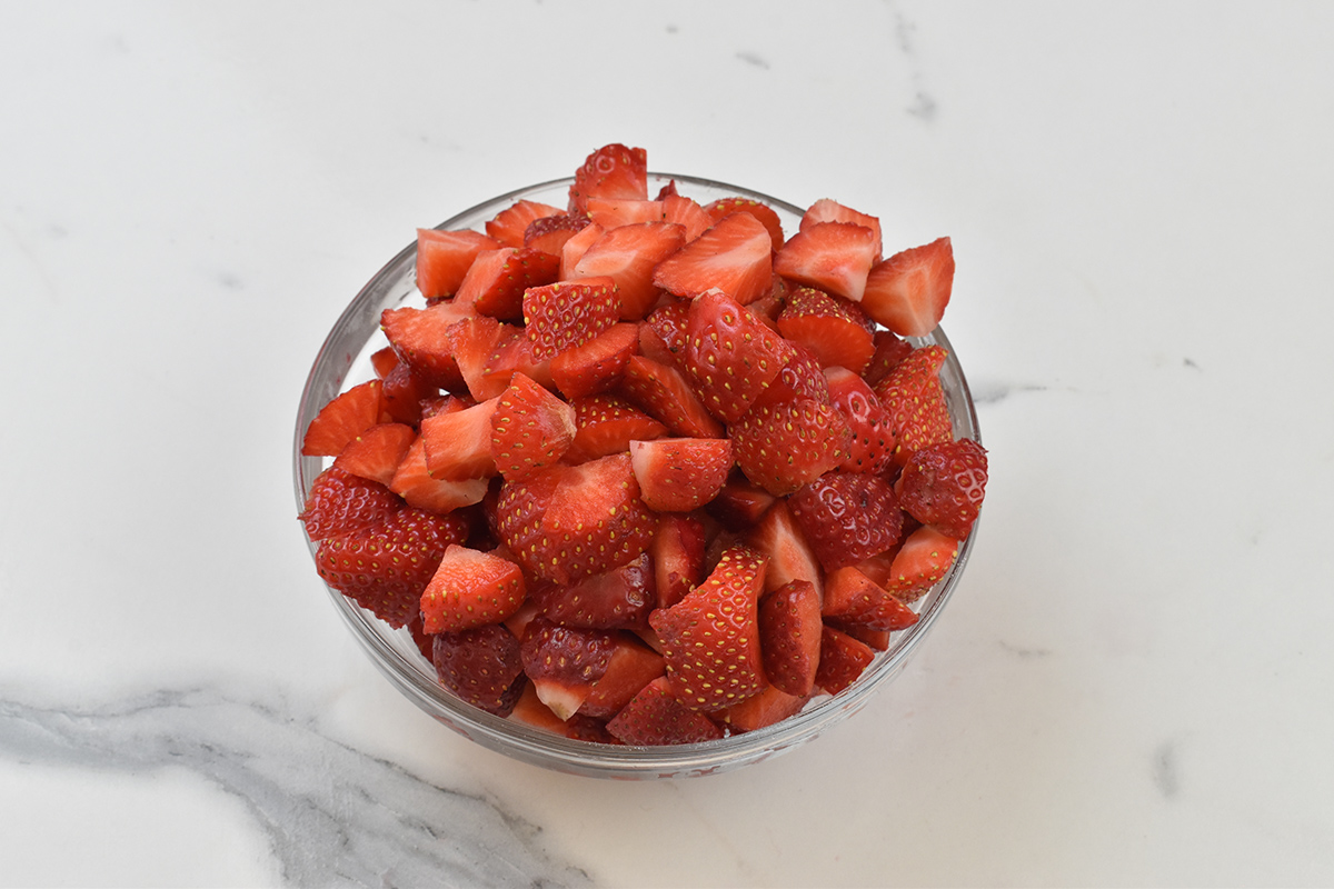 Prepariamo anche le fragole. Le mettiamo in una ciotola con acqua e bicarbonato, per una pulizia accurata, in modo da togliere un po’ dei pesticidi usati per la coltivazione. Le asciughiamo su carta assorbente, e le tagliamo minute in una ciotola, condiamo con succo di limone e poco zucchero, aggiungiamo l’amido di grano, che servirà a renderle meno acquose.