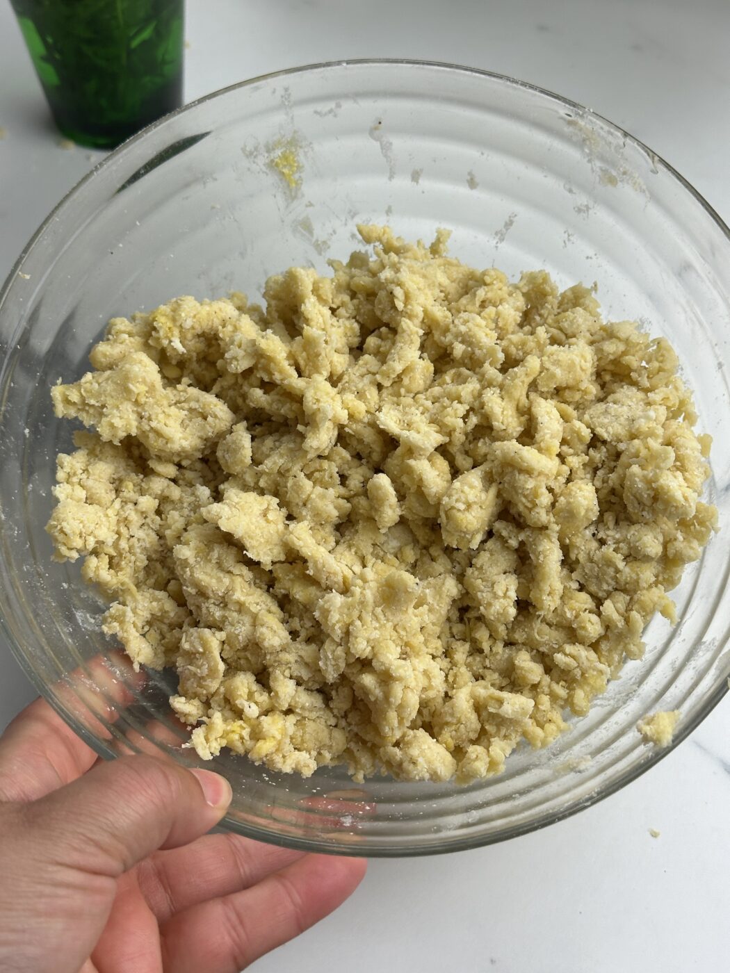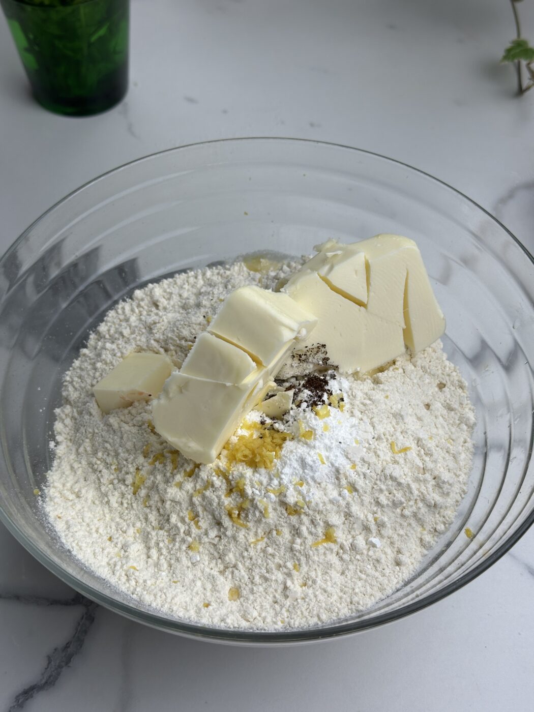 Prepariamo in una ciotola capiente la frolla sbriciolata. Mettiamo nella ciotola la farina, lo zucchero, il lievito, la scorza di limone e la vaniglia, poi anche il burro tagliato a pezzi, e iniziamo a lavorare, ad ottenere un composto sabbioso. Alla fine aggiungiamo anche le uova, e lavoriamo fino ad ottenere tante briciole.