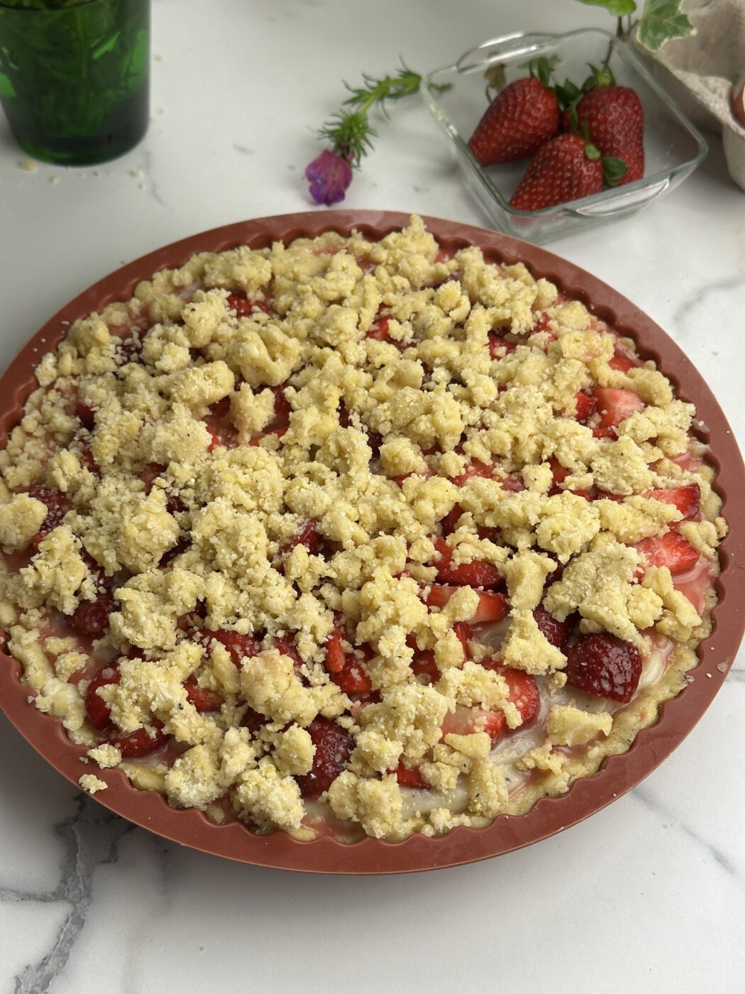 Versiamo più di metà delle briciole in teglia, e pressiamo per creare una base omogenea, bordi compresi. Farciamo la base con la crema raffreddata. Poi aggiungiamo le fragole, distribuendole in modo uniforme. Ricopriamo con la parte di impasto avanzato, con tante briciole che vanno a richiudere il ripieno, lasciando qua e là in vista le fragole.