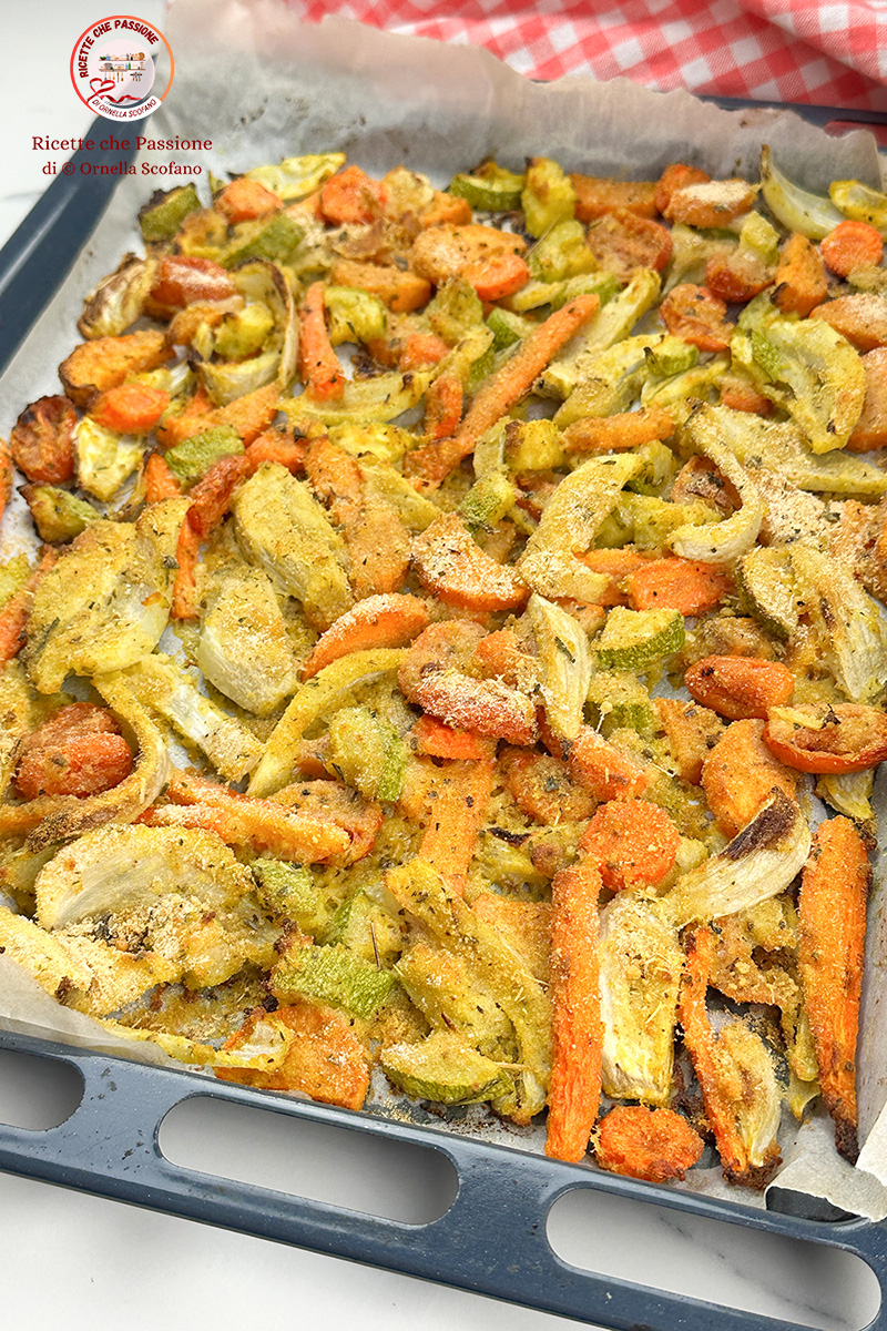 Verdure mix gratinate al forno, una ricetta veloce e sfiziosa svuota frigo, insomma a dirla tutta dovevo preparare un contorno di verdure per ben 8 persone ma non mi trovavo in casa così tante verdure tutte uguali per fare un contorno abbondante per tutti, così ecco l’idea di mettere in teglia tutte le verdure che avanzavano a fine settimana in frigo, avevo un finocchio – 5 carote – una zucchina – una bella patata dolce e qualche avanzo di pomodorini che nel mio frigo non mancano mai, così ecco qui la mia teglia di verdure mix gratinate al forno. Le ho preparate di corsa, all’ultimo minuto, poco prima di cena, così non ho neanche pensato di registrare la preparazione, ma prima di trasferirle in un bel piatto da portata ho pensato di scattare un paio di foto, deformazione professionale. Quando le ho portate in tavola sono state letteralmente prese d’assalto, tutti prendevano un’altra porzione e il felice più che mai davo la ricetta ai miei invitati che intanto mi chiedevano la ricetta, così eccomi qua, la do anche a voi, sono sicura che vi piacerà, e si credo che la rifarò a breve così vi preparo anche la video ricetta, anche se è davvero facilissima. Ovviamente si possono aggiungere anche altre verdure, come broccoli e cavolfiore, zucca, cipolla, patate.