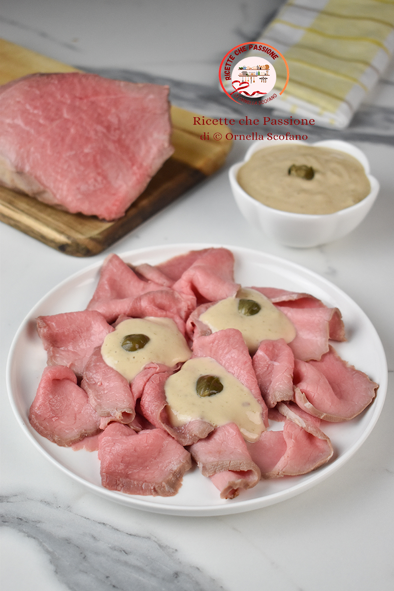 Il vitello tonnato più buono che abbia mai mangiato, e si quello che ho preparato io, per la prima volta, con cottura a bassa temperatura, con il roner. Ho acquistato il roner dopo Natale, l’ho usato per preparare più volte delle ottime costine di maiale, ma non avevo ancora provato a realizzare altre ricette un po’ intimorita, ma finalmente oggi mi sono decisa a preparare qualcosa di speciale, e adatto alla calda giornata di oggi, un piatto che amo e gusto sempre con piacere, il vitello tonnato, e incredibilmente non avevo mai provato a farlo prima, neanche con la ricetta classica, che prevede di bollire la carne per un’ora circa. Cercando un po’ sul web ho visto varie preparazioni, alcune simili, altre molto diverse, ma tutte parlano di vitello tonnato ricetta originale piemontese, mah, quale sarà quella vera, e chi lo sa, io non sono neanche piemontese, ma si fieramente calabrese, però sono sicura che mia zia di Saluzzo mi darà ora delle diritte in merito, ma intanto io pubblico il mio vitello tonnato, come sempre alla mia maniera, ormai parlare di ricetta originale è quasi vietato. Per la ricetta ho usato un bel pezzo di girello di manzo, cottura a bassa temperatura con il mio roner inkbird ISV-101W e per la salsa pochi e semplici ingredienti, tonno, acciughe, capperi e maionese, con un po’ di olio di oliva, la maionese mi raccomando la mia fatta in casa con frullatore ad immersione, è speciale.