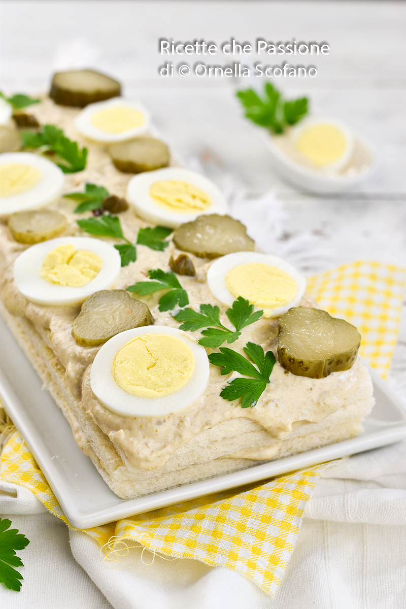 Torta tramezzino di Pasqua buona in qualsiasi occasione, anche per un picnic, o per una giornata al mare, tranquilli che ora l’estate arriva e vedrete quante occasioni avremo per prepararla. Io ne ho preparato una versione molto semplice e veloce per Pasqua farcita con crema al tonno golosa con uova sode, una crema che preparo spesso per farcire i miei tramezzini, proprio quelli che mangio di solito sotto l’ombrellone, ma è buonissima per farcire tartellette, e crostini per l’antipasto o l’aperitivo, per una serata in compagnia, presto fatta per accompagnare i crostini, senza fatica e con poca spesa.