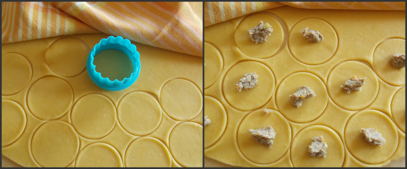 Per prima cosa dovrete preparare il ripieno per cappelletti come descritto QUI, poi mentre si raffredda passate alla preparazione della pasta all’uovo come descritto QUI. Lasciate riposare la pasta mezz’ora prima di stenderla, poi trasferitela sulla spianatoia infarinata e stendetela con il mattarello ad uno spessore di 1mm. A questo punto, coprite la sfoglia con una tovaglia pulita, per evitare che si secchi, e lasciatene scoperta solo una parte. Su questa, utilizzando il coppa pasta, ricavate dei dischetti sui quali posizionerete pochissimo impasto al centro.